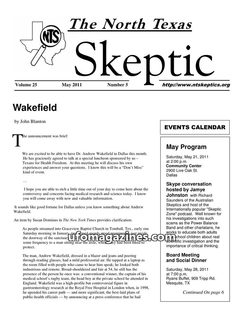 This issue of The North Texas Skeptic covers the controversial appearance of Dr. Andrew Wakefield in Dallas, discussing his discredited research on the vaccine-autism link. It also