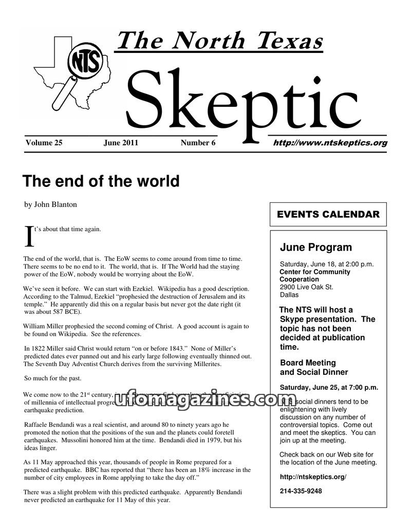 This issue of The North Texas Skeptic examines various end-of-the-world predictions, including those by Ezekiel, William Miller, Raffaele Bendandi, and Harold Camping, highlighting