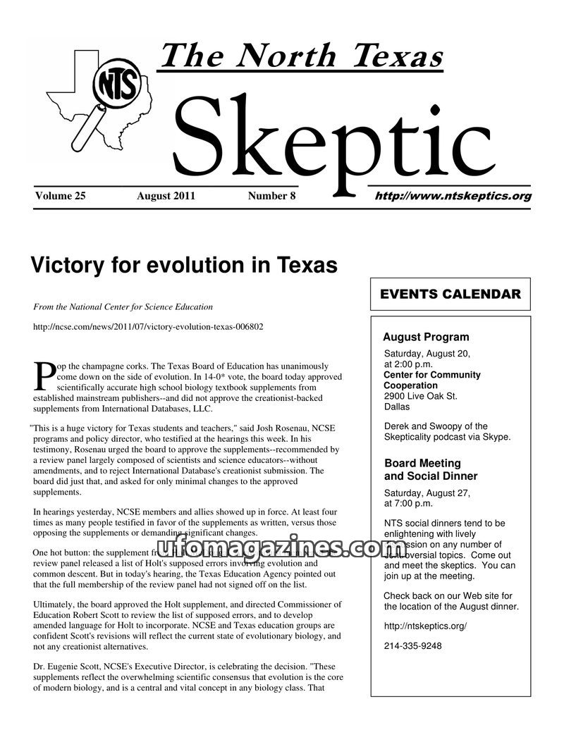 The August 2011 issue of The North Texas Skeptic highlights a significant victory for evolution education in Texas, where the State Board of Education approved scientifically accur