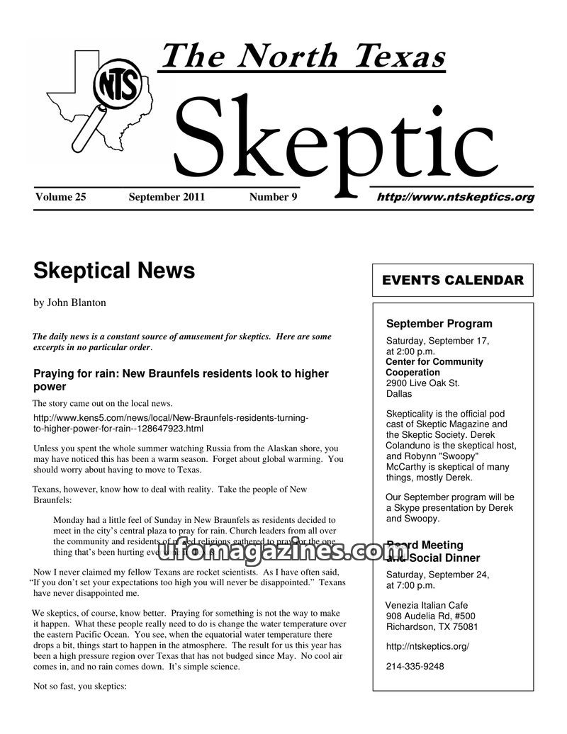 This issue of The North Texas Skeptic features articles on various skeptical topics. It discusses the futility of praying for rain, debunks the 'Nemesis' star theory, and critiques