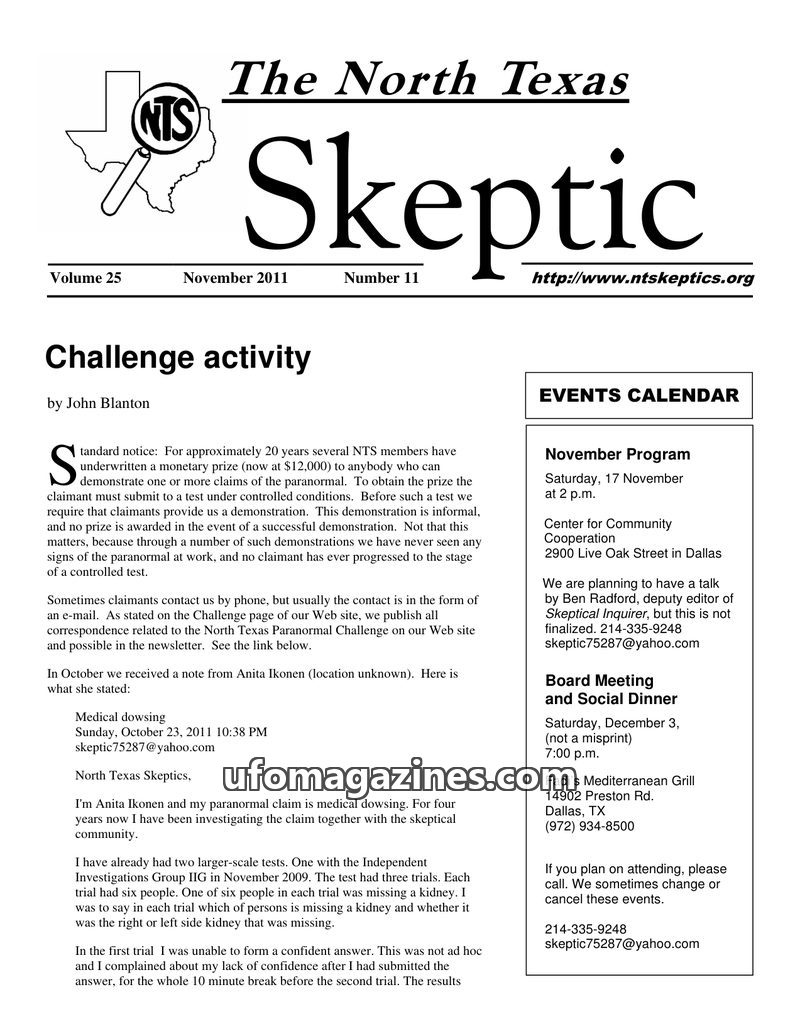 This issue of The North Texas Skeptic details Anita Ikonen's claim of medical dowsing ability, her past tests, and her request for further investigation by the NTS. It also covers