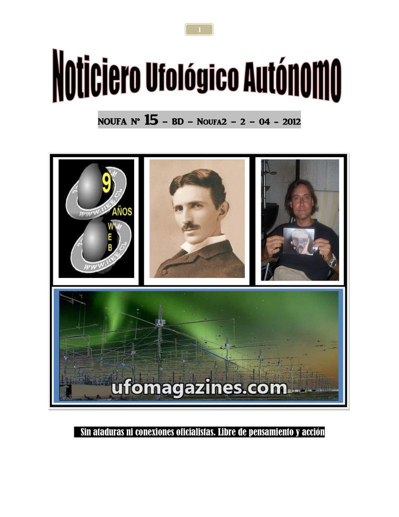 This issue of Noticiero Ufológico Autónomo (Issue 15, April 2012) delves into various anomalous phenomena. It features an article on Nikola Tesla, strange beings in Colombia, and a