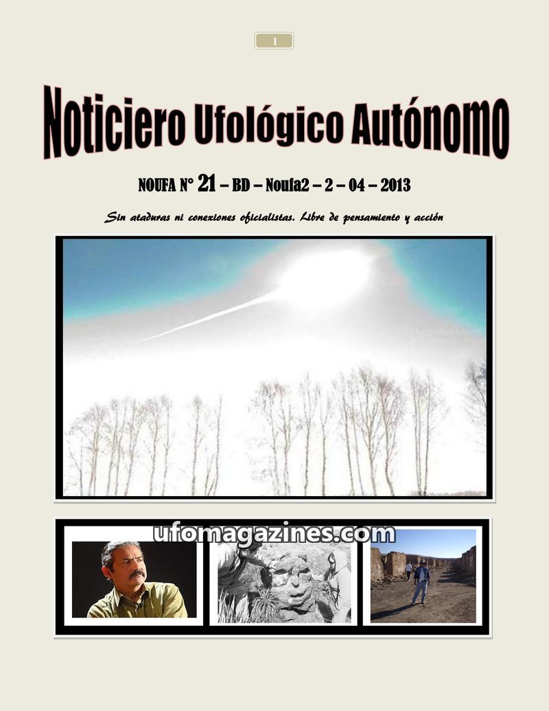 This issue of Noticiero Ufológico Autónomo (NOUFA) No. 21, dated April 2, 2013, covers a range of topics including a recent meteorite event in Russia, the discovery of a Moai-like