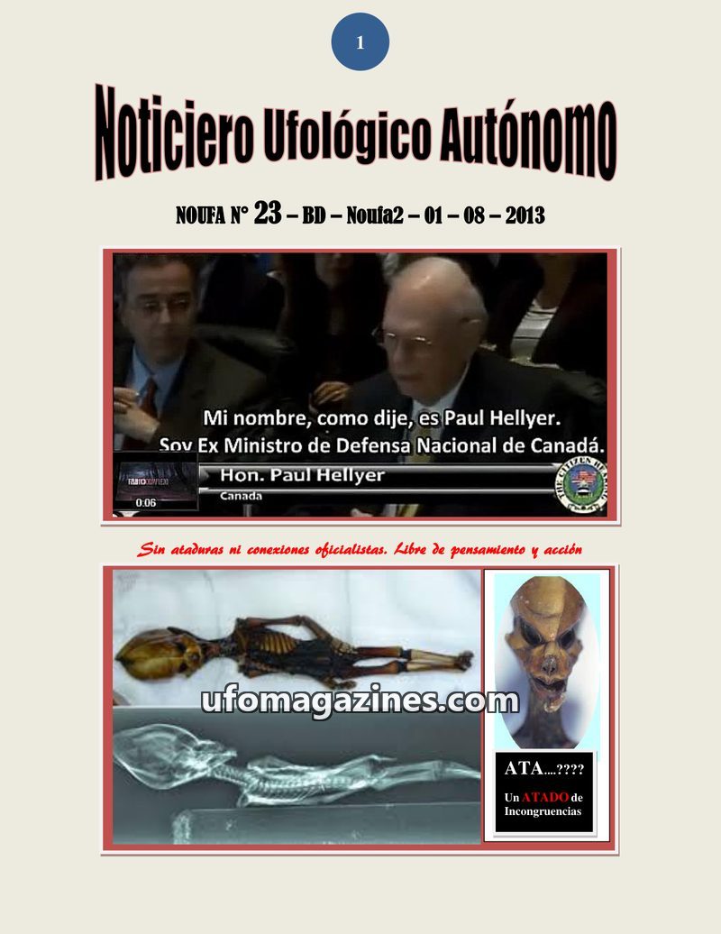 This issue of Noticiero Ufológico Autónomo covers several UFO-related topics. It features an interview with former Canadian Defense Minister Paul Hellyer, who claims extraterrestri
