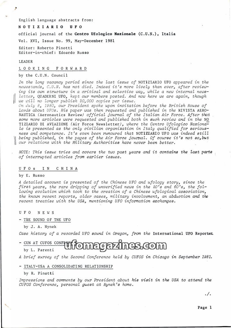 This issue of NOTIZIARIO UFO, published by the Centro Ufologico Nazionale (C.U.N.) in Italy, covers the period May-December 1981. It includes articles on UFOs in China, UFO news in