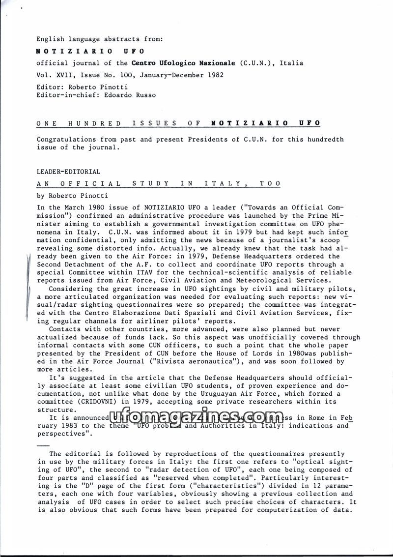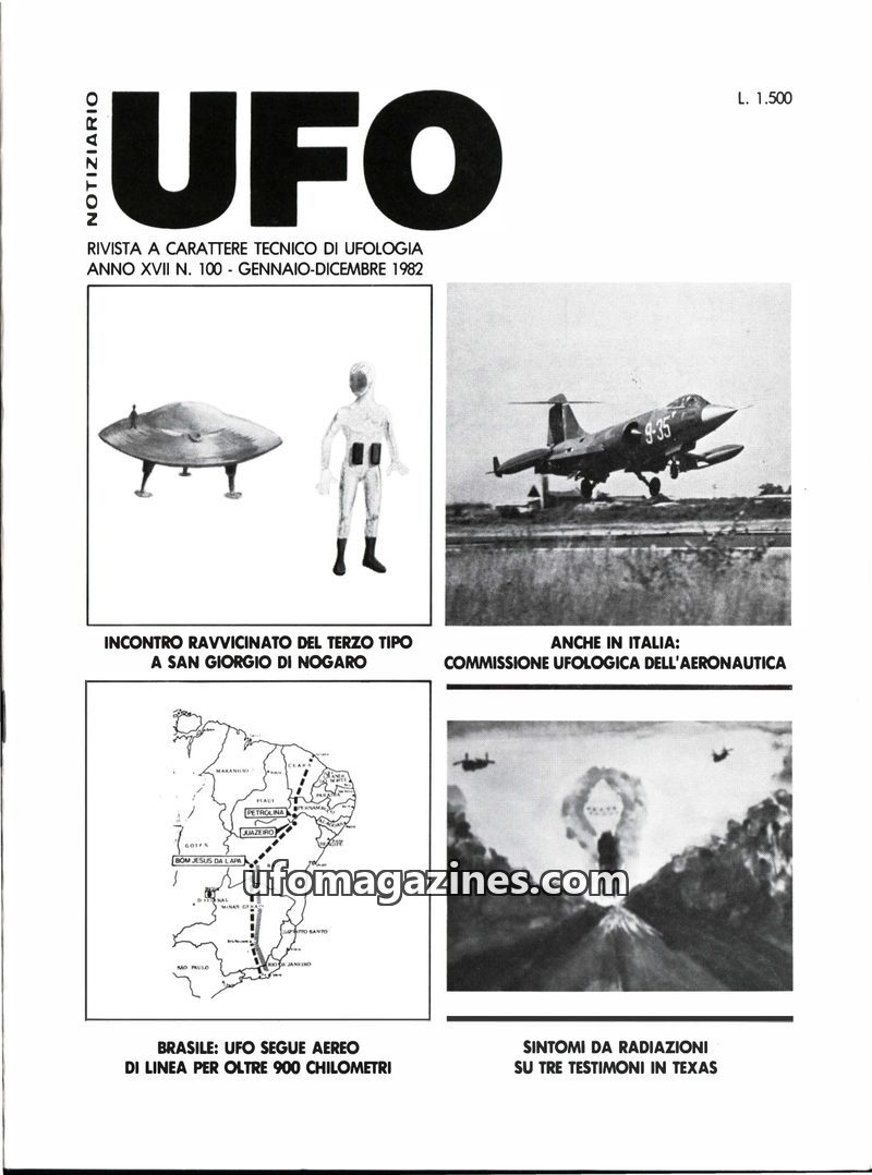 This issue of Notiziario UFO celebrates its 100th edition with an editorial by Roberto Pinotti discussing Italy's official investigation into UFO phenomena, initiated in 1979 and i