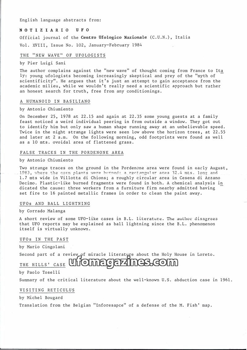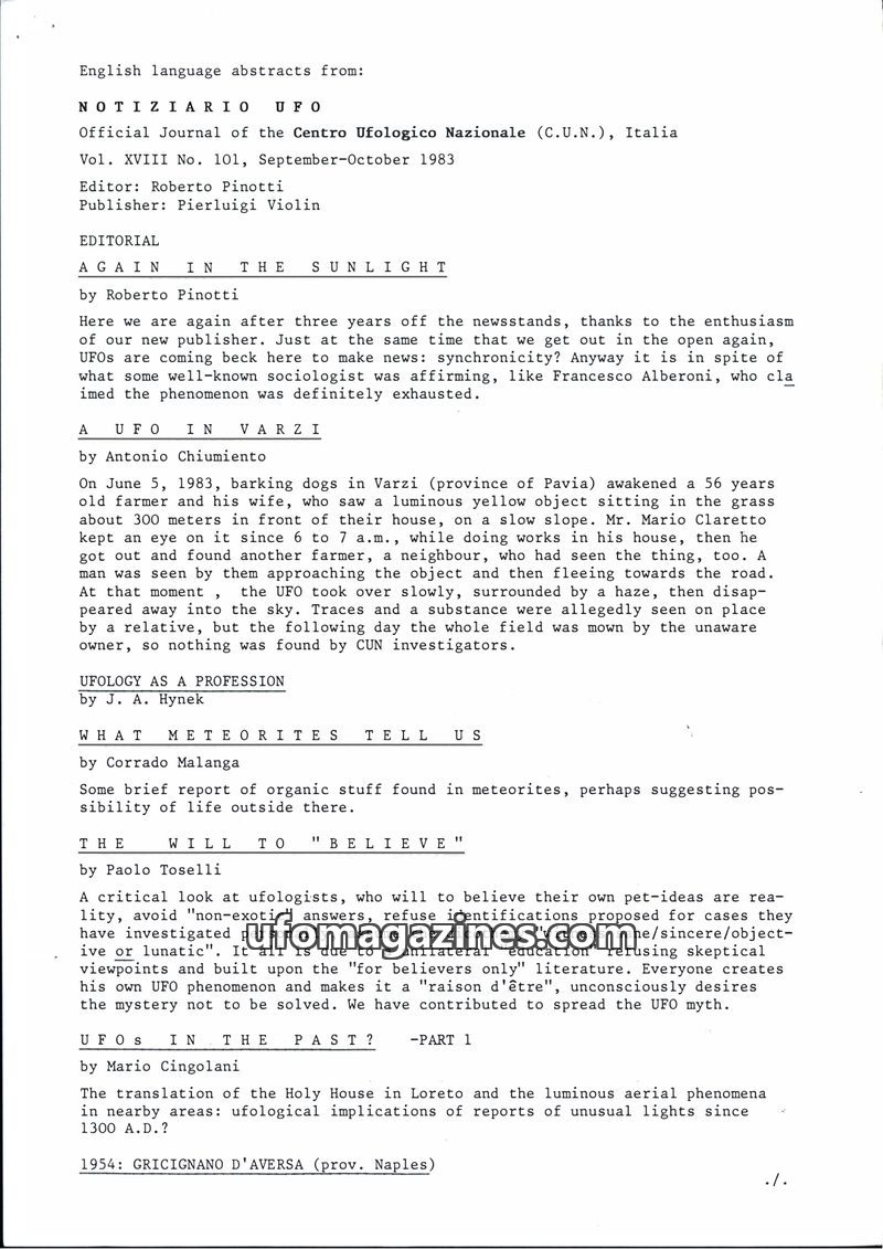 This issue of Notiziario UFO, the first under a new publisher, resumes publication after a hiatus. It features articles on a UFO sighting in Varzi, Italy, in 1983, and a retrospect