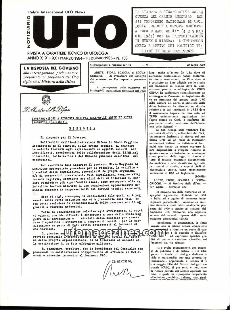 This issue of UFO magazine details the Italian government's official response to parliamentary inquiries regarding UFO sightings, stating that while the Air Force investigates, con