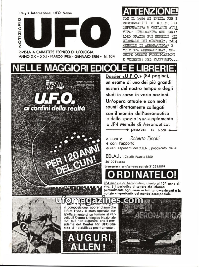 This issue of UFO magazine, dated March 1985 - January 1986, focuses on ufological news and investigations. It features a report on a UFO sighting in Portonovo, Ancona, on August 1