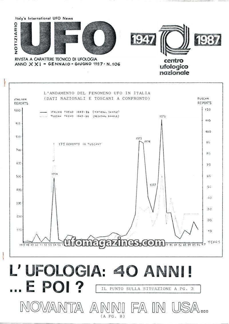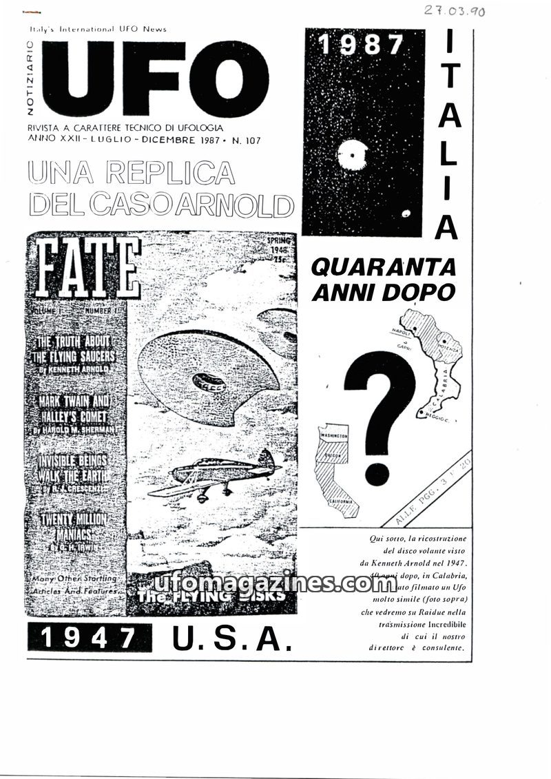 This issue of UFO magazine commemorates the 40th anniversary of the Kenneth Arnold UFO case, which occurred in 1947. It presents a recent sighting in Crosia, Italy, in 1987, that b