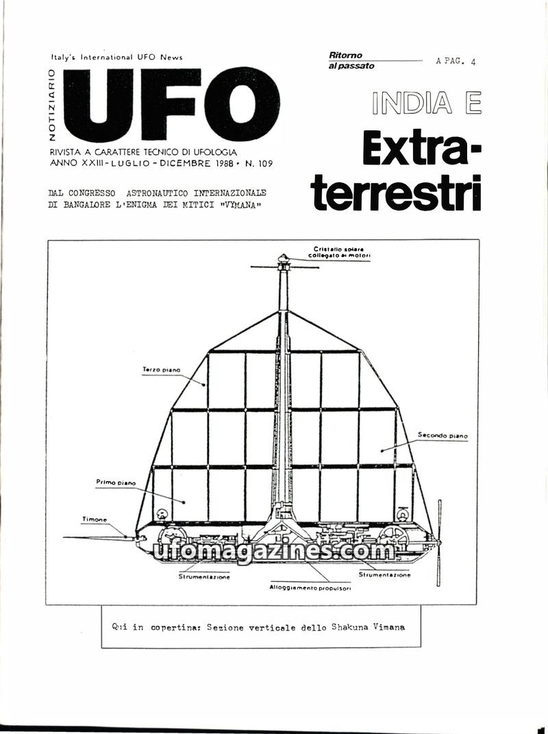 This issue of UFO Magazine delves into the mysteries of ancient Indian flying machines, the 'Vimanas,' as presented by sociologist Roberto Pinotti at the International Astronautica