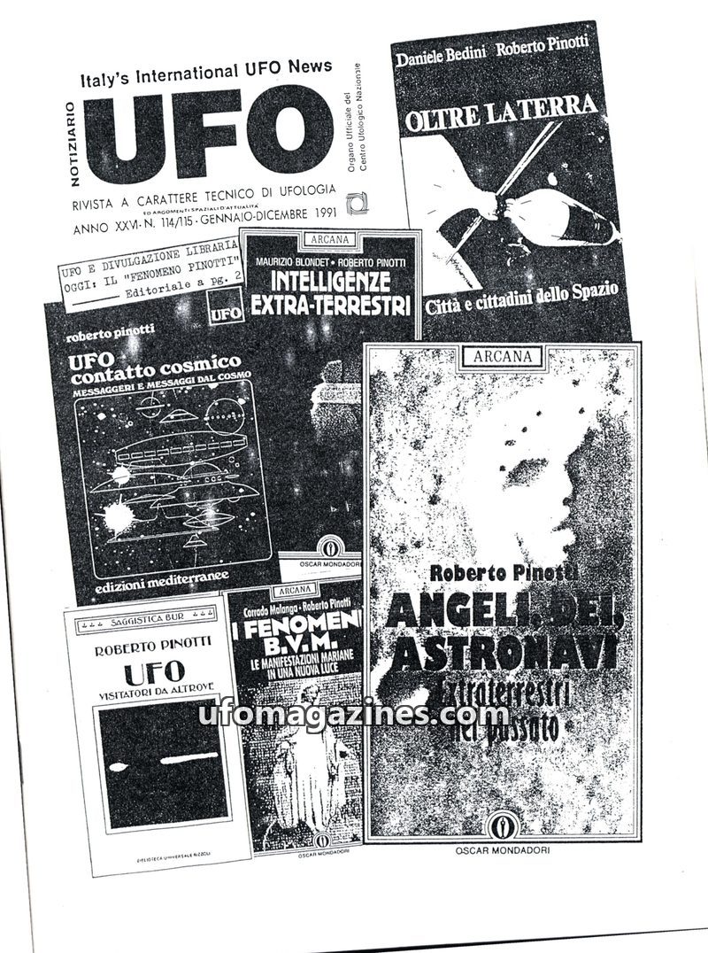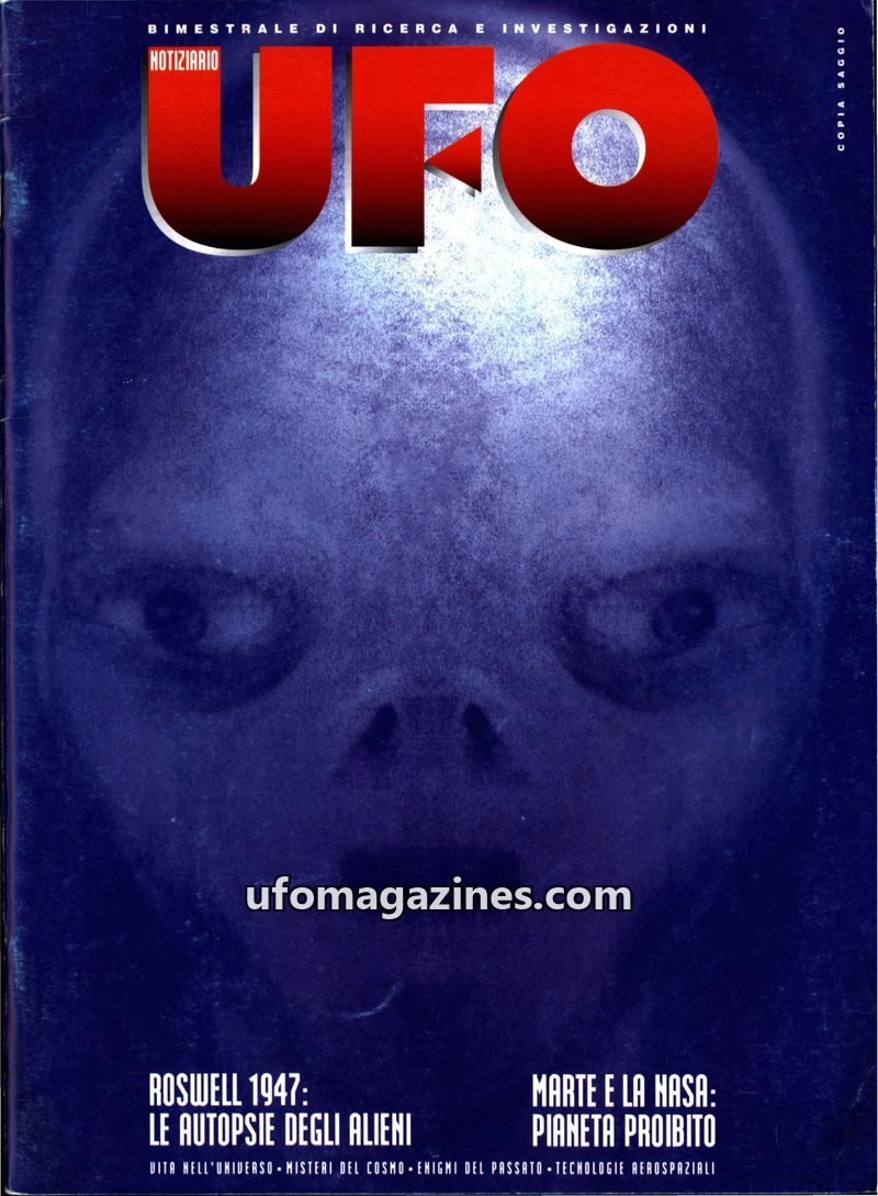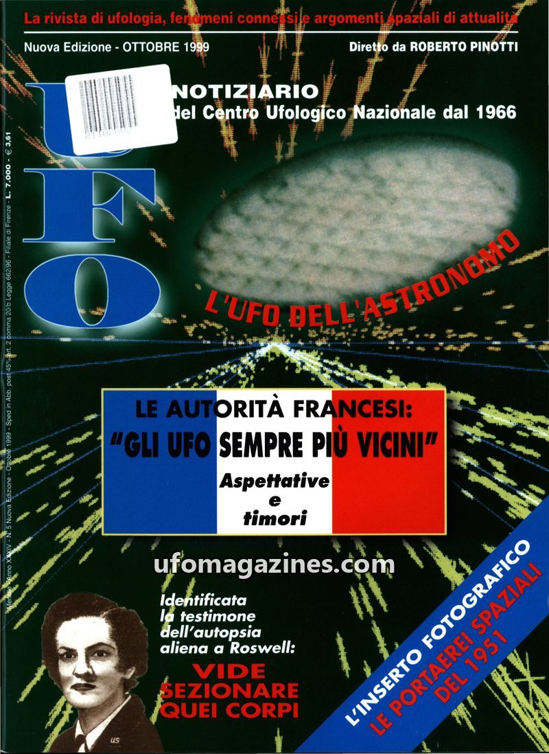 This issue of UFO Notiziario features a cover story on French authorities' statements about UFOs being 'closer,' a report on the identification of the Roswell autopsy witness, and