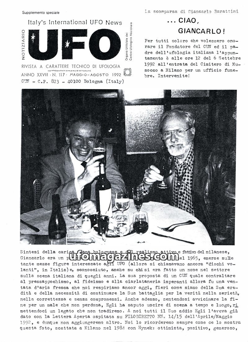 This issue of Italy's International UFO News commemorates Giancarlo Barattini, founder of the Centro Ufologico Nazionale (CUN), who passed away. The magazine features a discussion