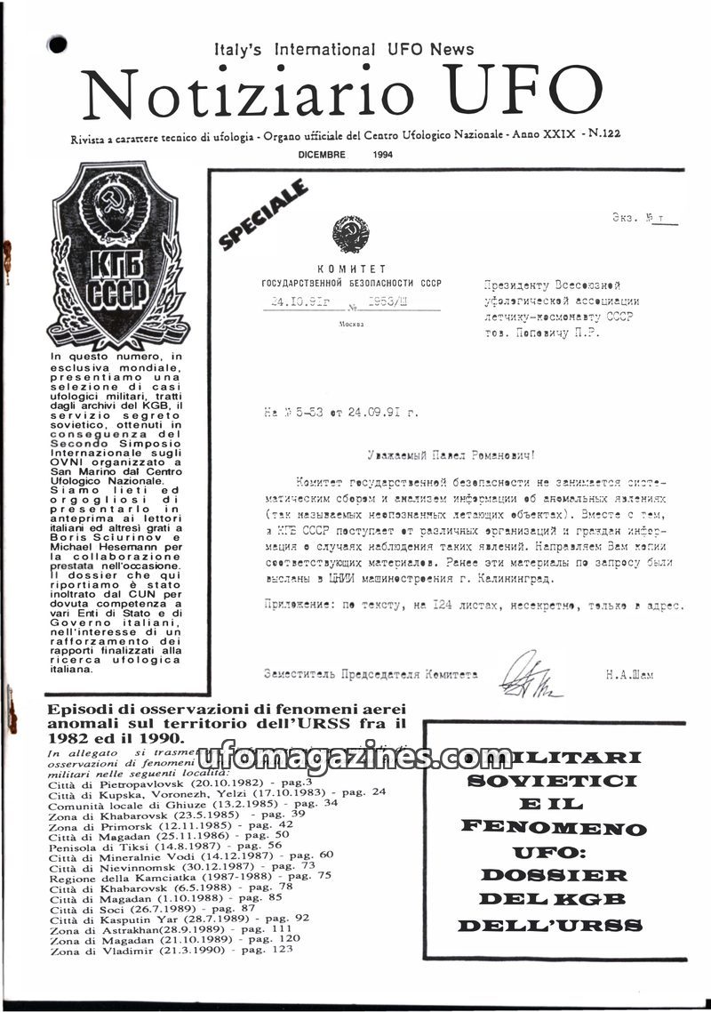 This issue of Notiziario UFO presents a special dossier of Soviet military UFO observations, drawn from KGB archives. It includes detailed reports from pilots, air traffic controll