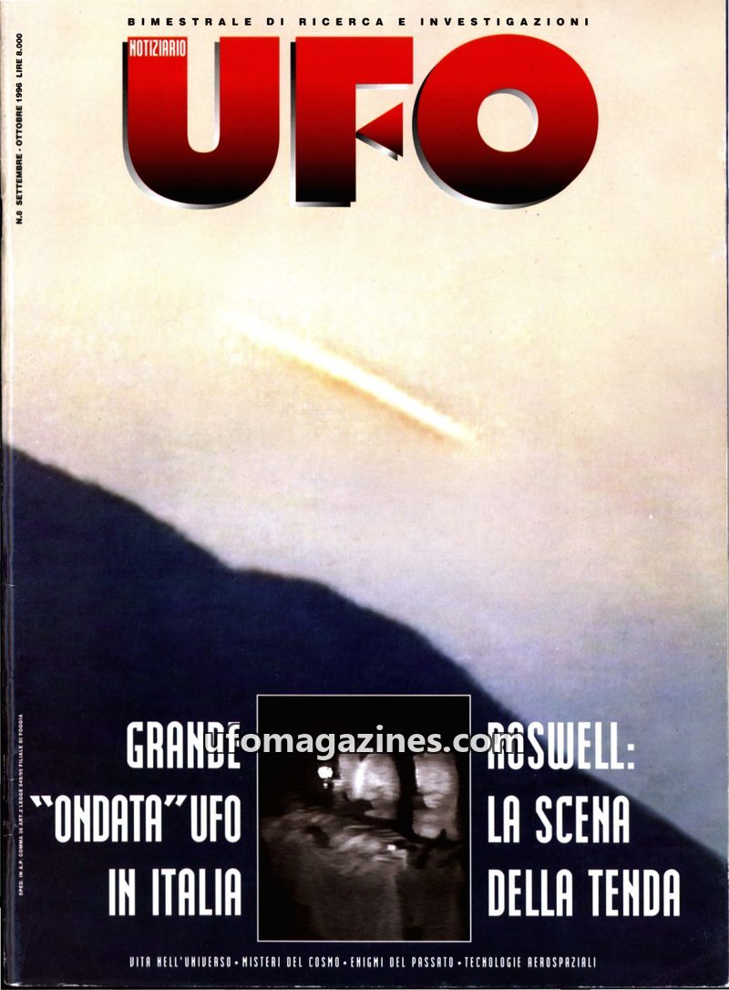 This issue of UFO NOTIZIARIO investigates a significant UFO wave in Italy during June-July 1996, detailing numerous sightings. It also delves into the controversial 'tent scene' fo