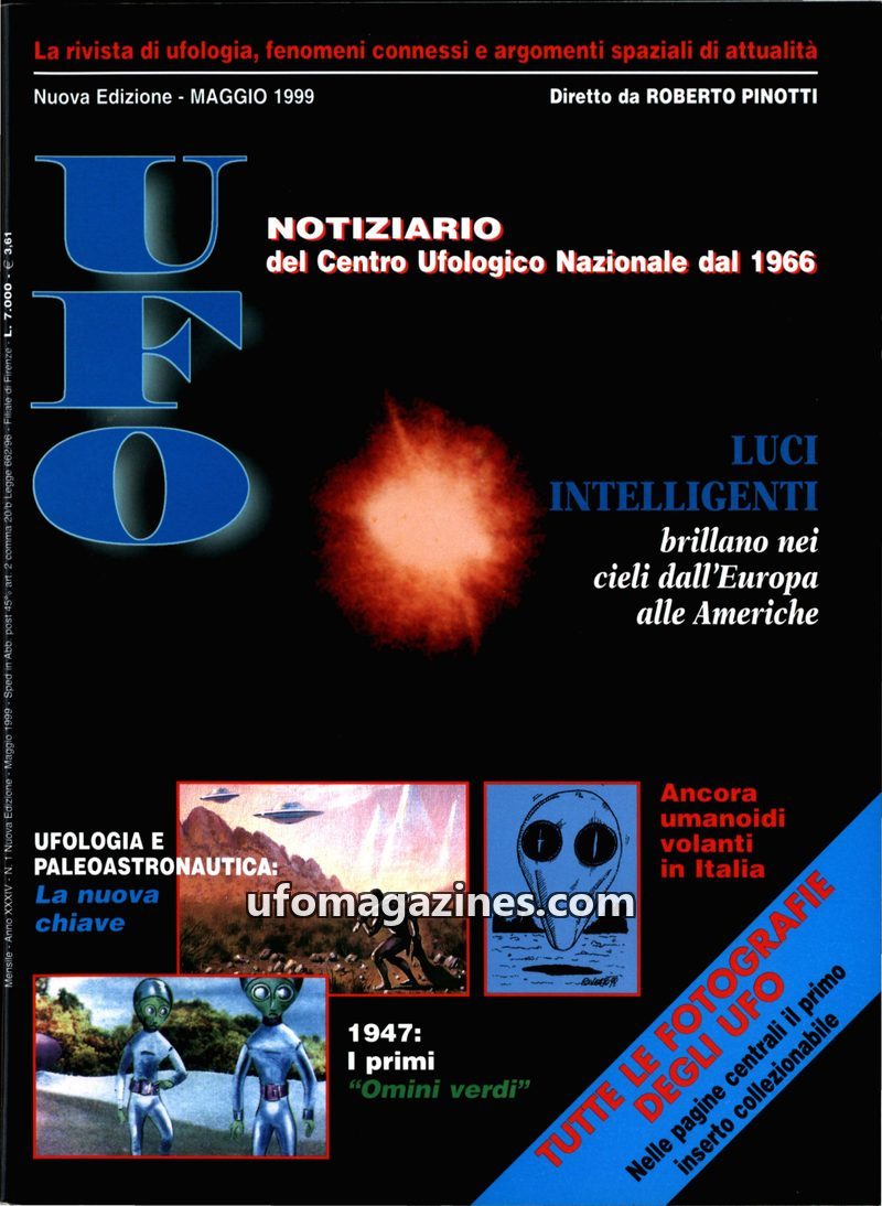 This issue of UFO Notiziario, dated May 1999, focuses on 'Intelligent Lights' seen across Europe and the Americas. It features articles on ufology and paleoastronautics, the histor