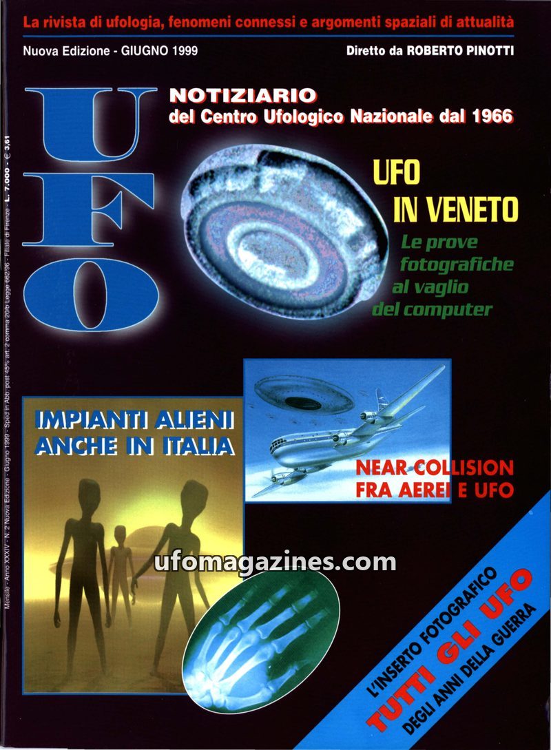 This issue of UFO Notiziario from June 1999 delves into photographic evidence of UFOs in Veneto, analyzed by computer. It revisits the infamous Flatwoods Monster case from 1952, de