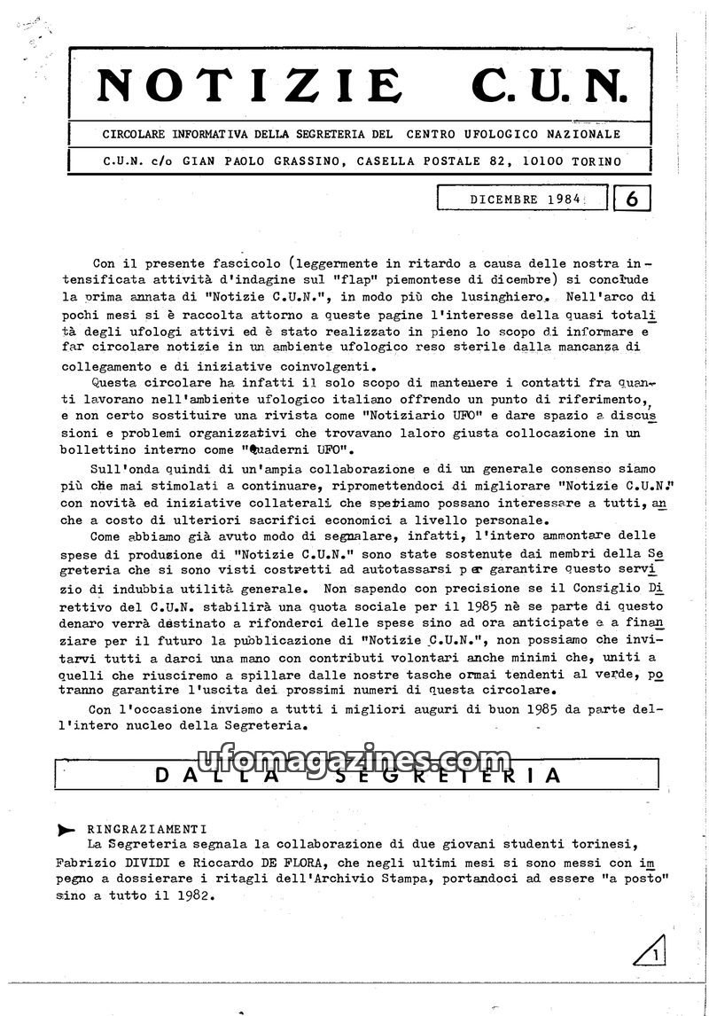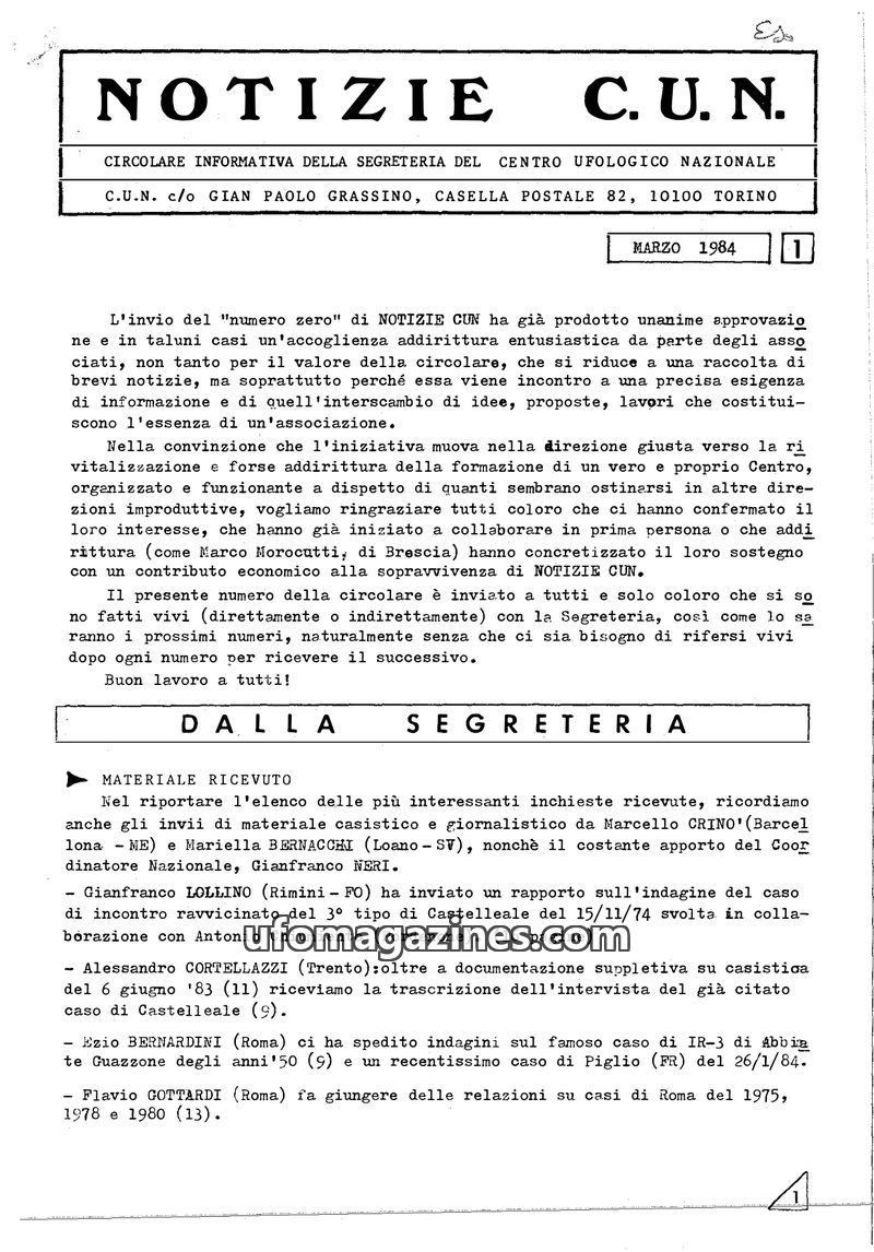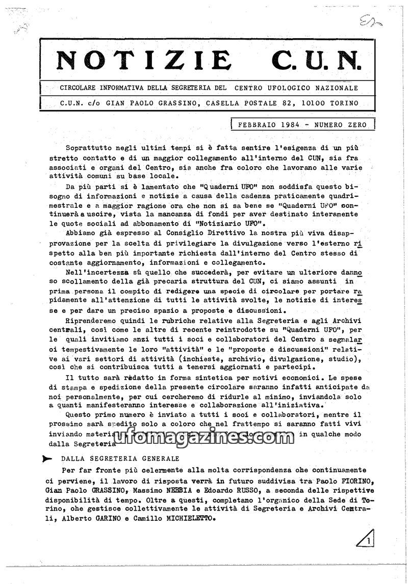 This issue of 'NOTIZIE C.U.N.' (Issue Zero, February 1984) serves as an informational circular from the Centro Ufologico Nazionale (CUN) to address the need for better internal com