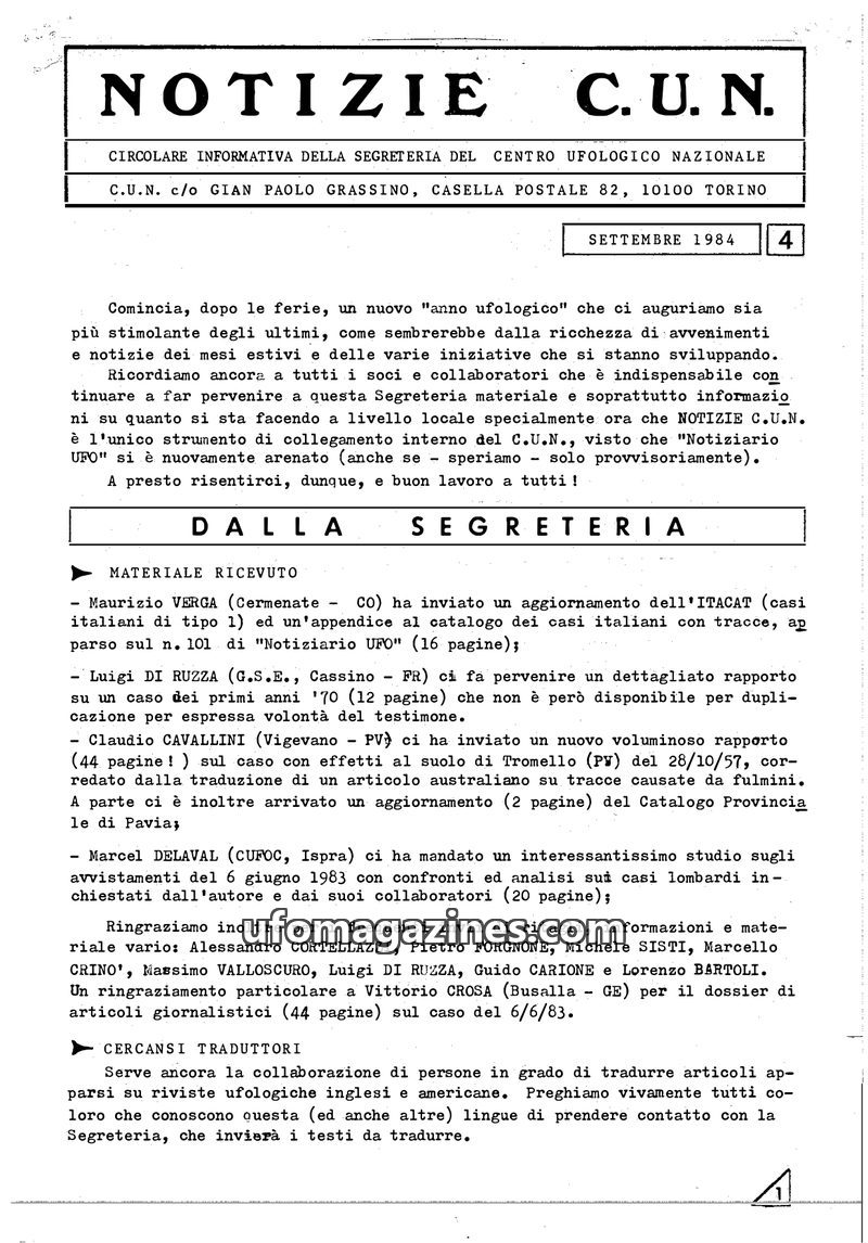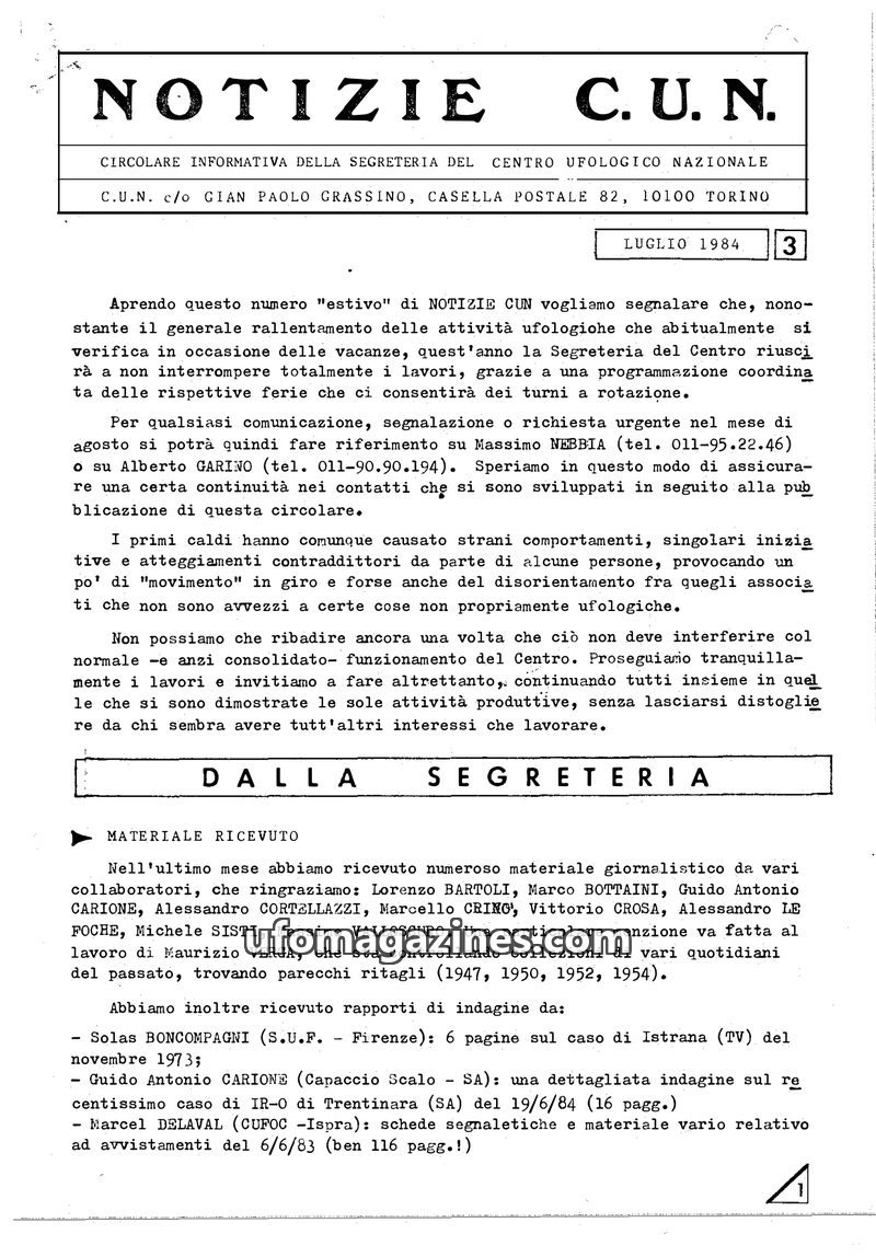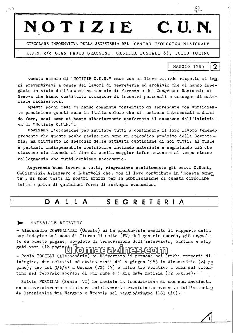 This issue of NOTIZIE C.U.N. from May 1984 details the activities of the National Ufological Center. It reports on received investigation materials, regional ufological catalogs, a