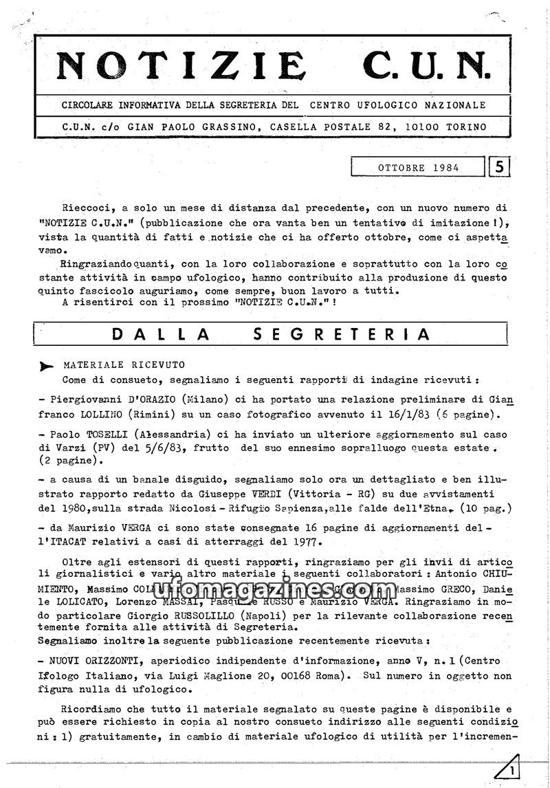 This issue of Notizie C.U.N. from October 1984 highlights recent UFO reports and ongoing research by the Centro Ufologico Nazionale. It details received investigation reports, incl