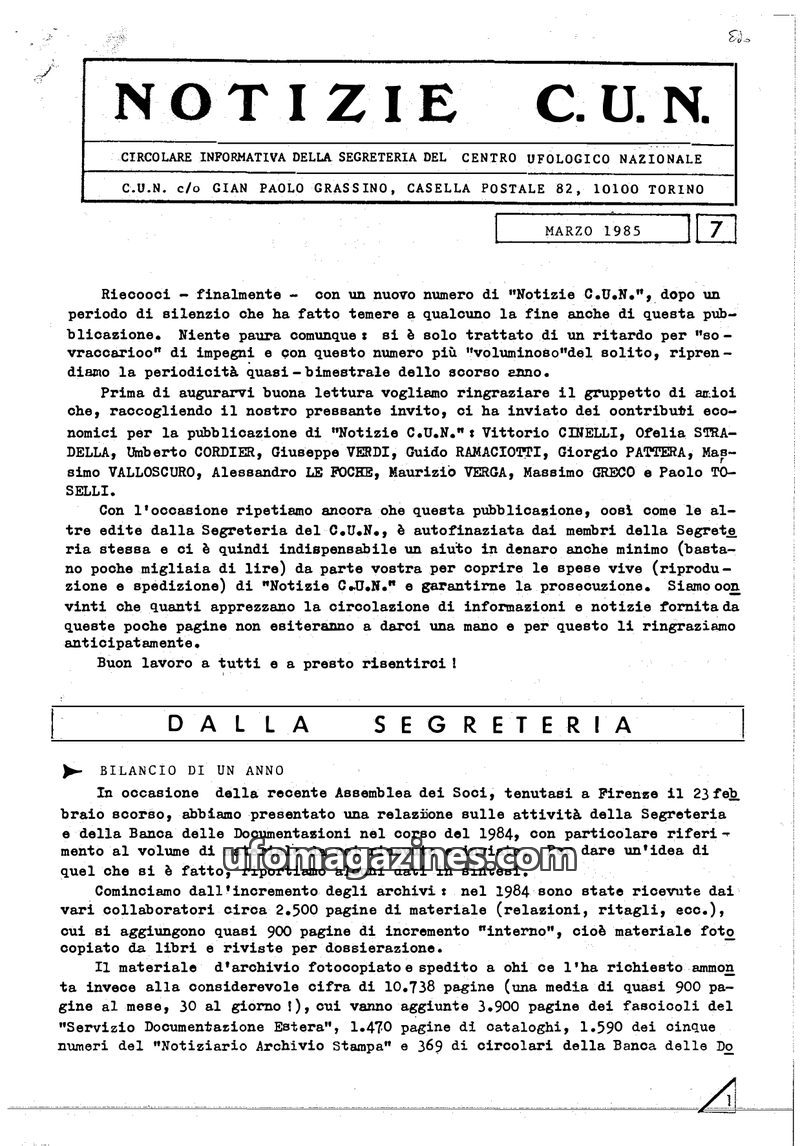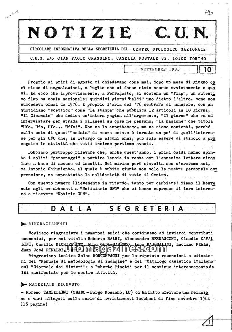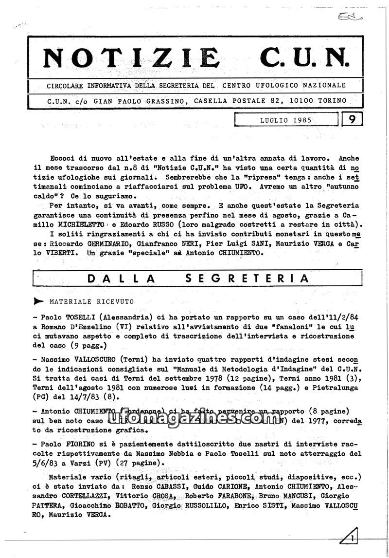 This issue of 'Notizie C.U.N.' from July 1985 highlights the ongoing work of the Centro Ufologico Nazionale (C.U.N.) in collecting and investigating UFO reports. The Secretariat re