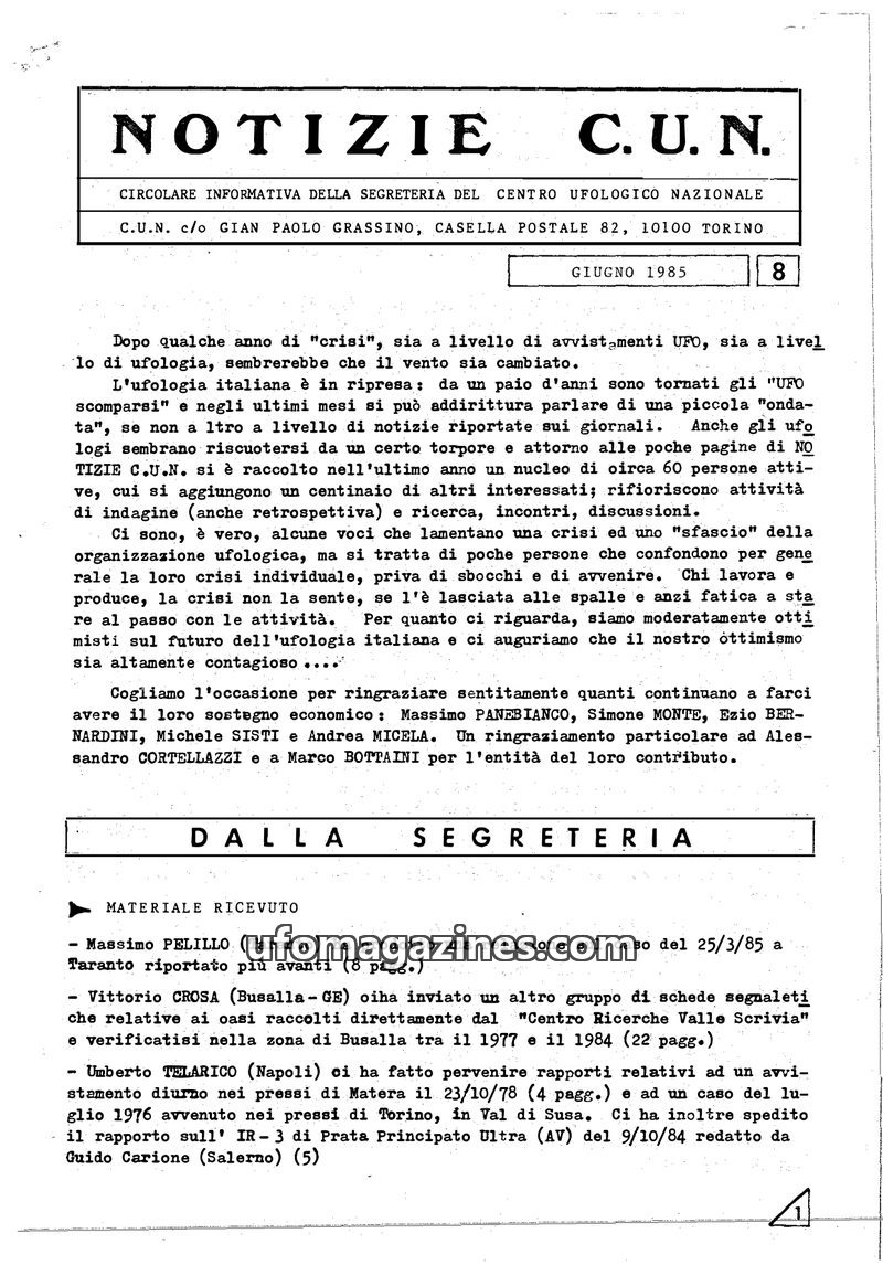 The Italian ufology scene is showing signs of revival in June 1985, with a reported increase in sightings and media coverage. The C.U.N. (Centro Ufologico Nazionale) has seen a gro
