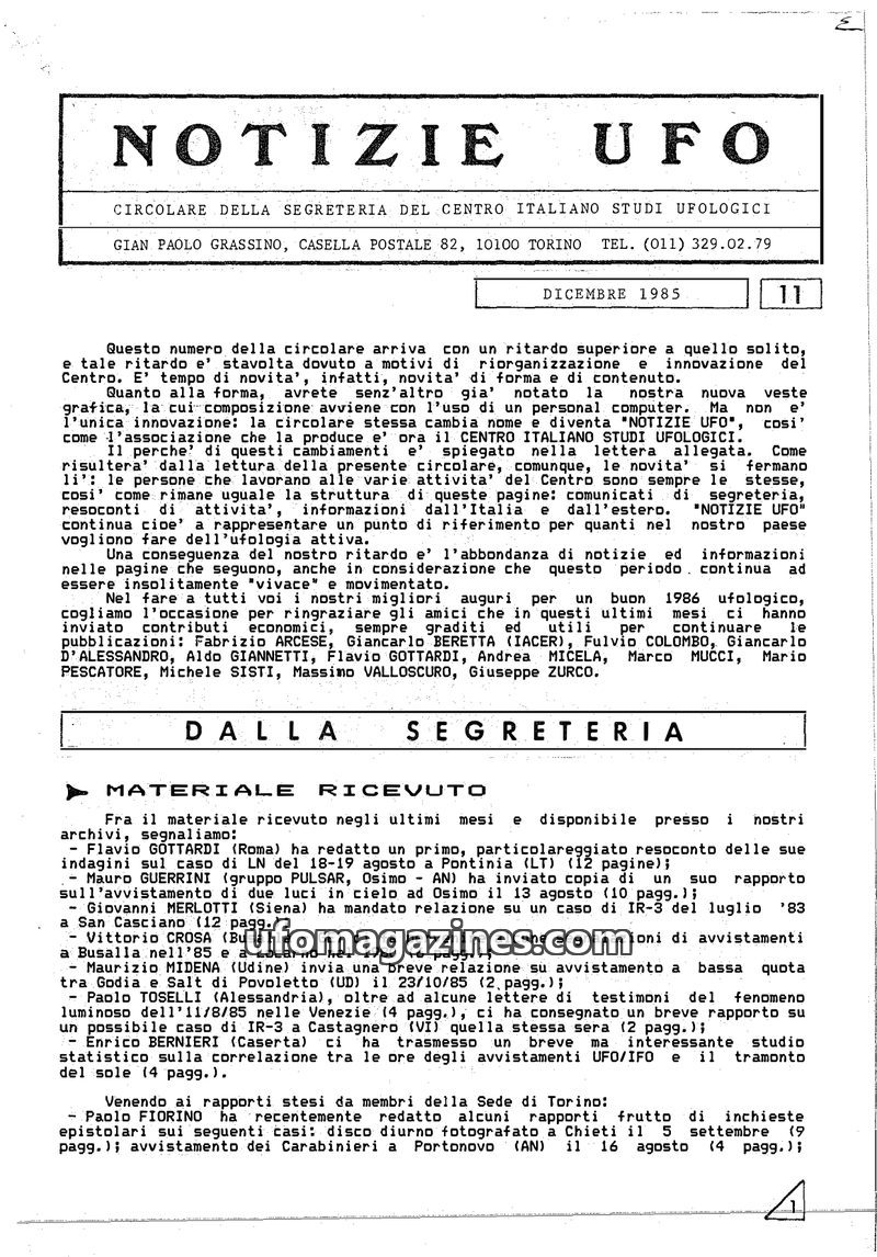 This issue of Notizie UFO (December 1985) marks a redesign and rebranding for the Centro Italiano Studi Ufologici. It details numerous received reports from various investigators a