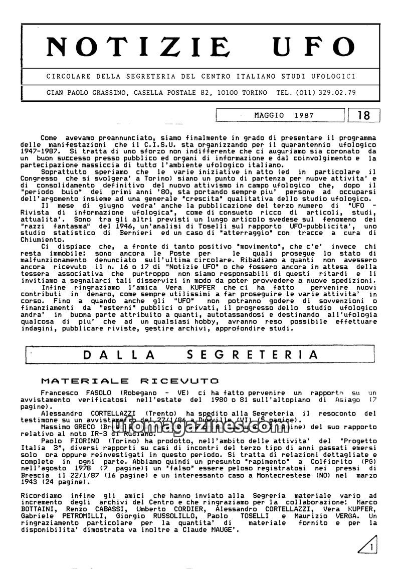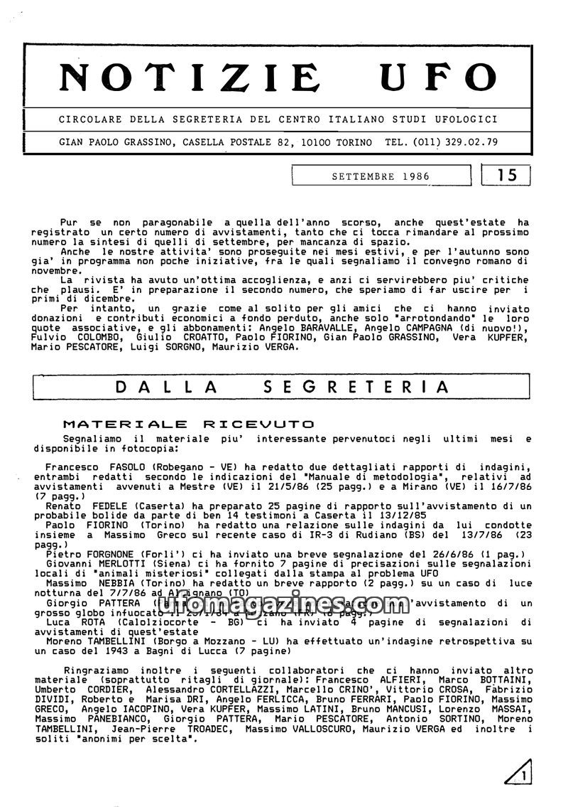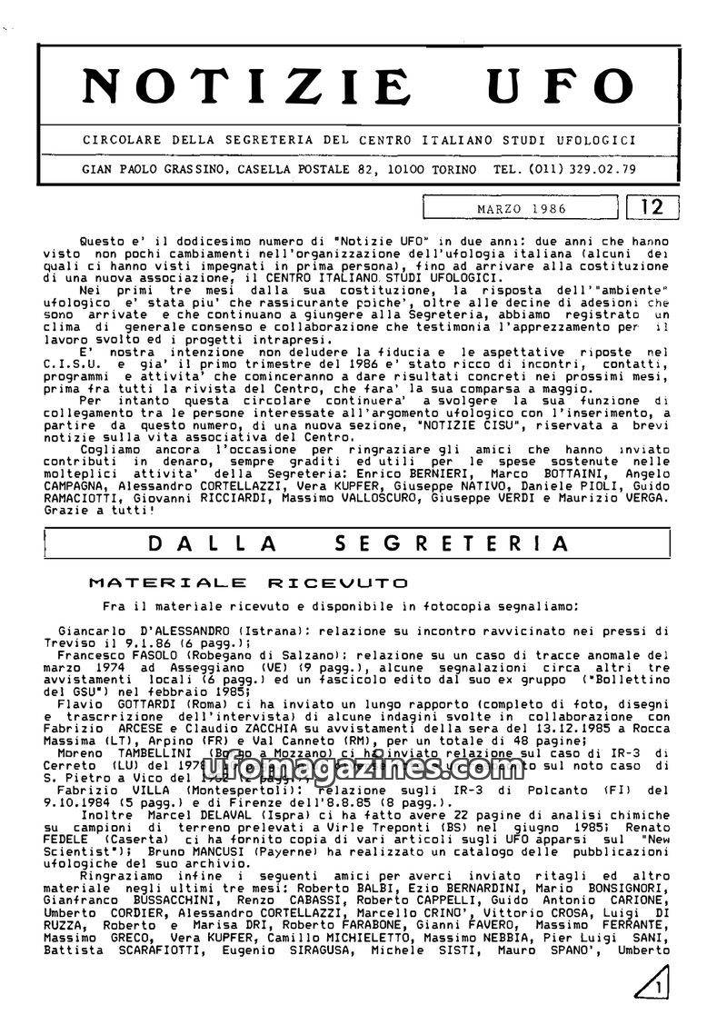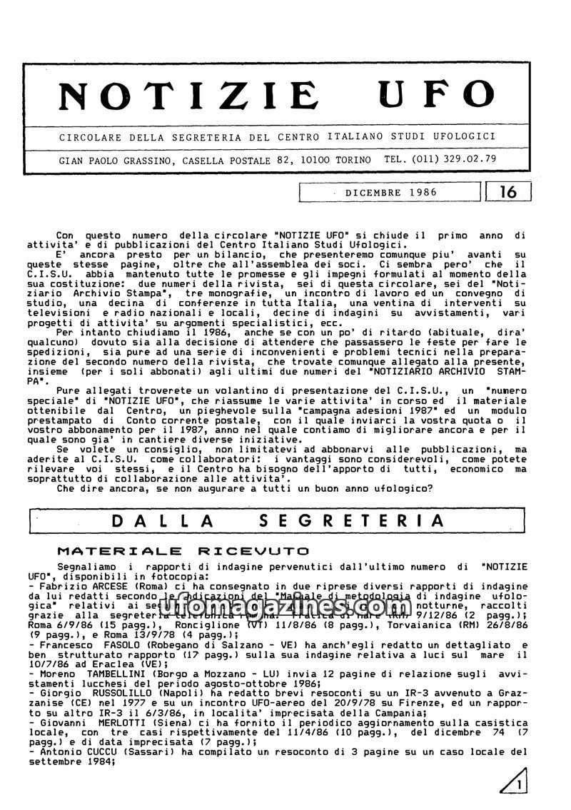 This December 1986 issue of "Notizie UFO" marks the end of the first year of activity for the Centro Italiano Studi Ufologici (CISU). The circular details the organization's accomp