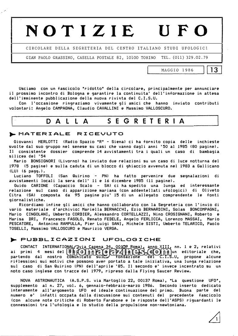 This issue of 'Notizie UFO' from May 1986 announces a reduced circulation due to an upcoming new magazine and an upcoming meeting in Bologna. It details received materials from var