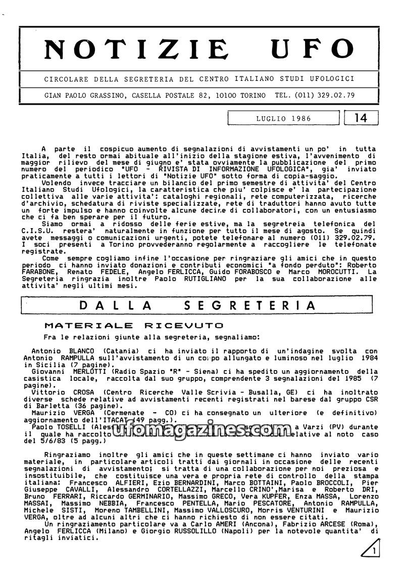 This issue of 'Notizie UFO' reports on a busy summer for UFO sightings in Italy, with numerous cases documented from July and August 1986. It highlights ongoing investigative work