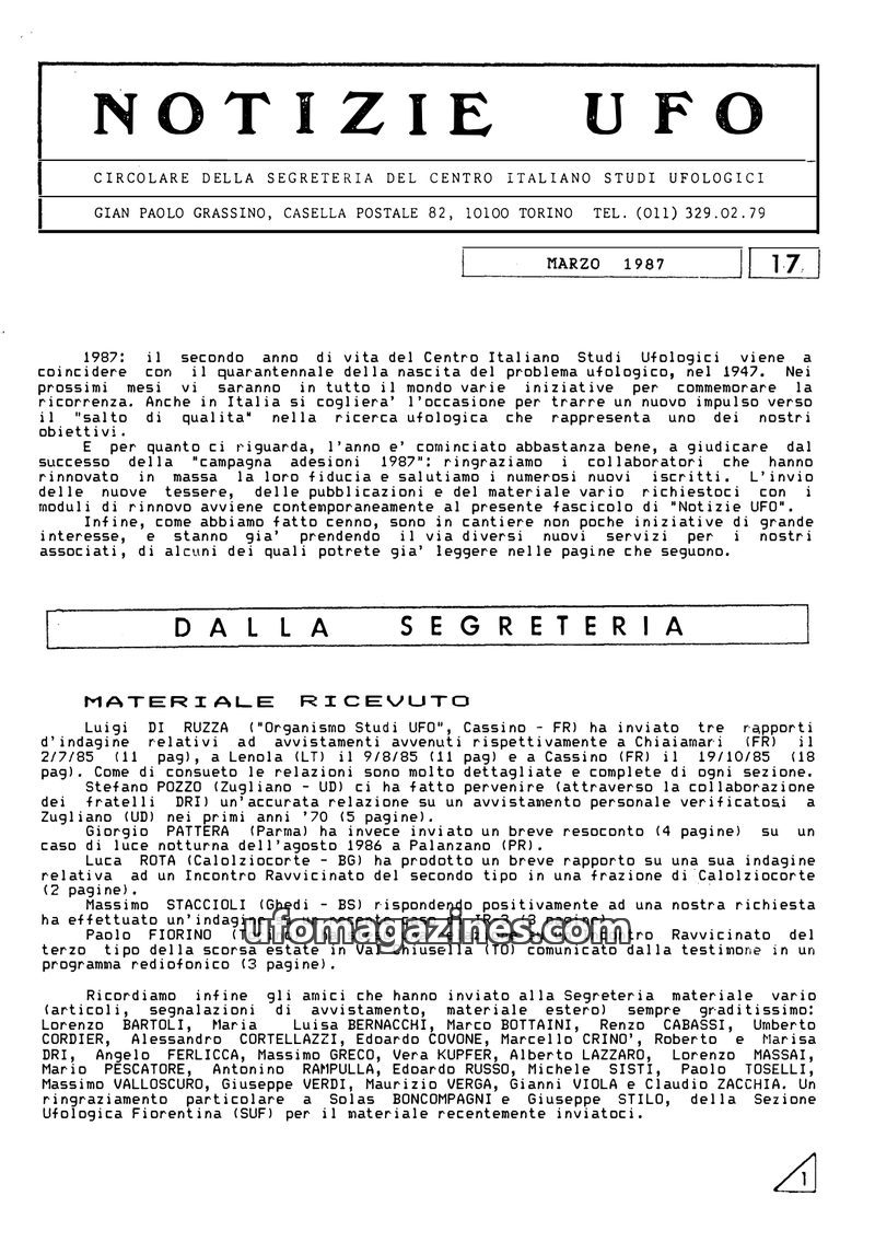 This issue of Notizie UFO, dated March 1987, marks the second year of the Centro Italiano Studi Ufologici (CISU) and the 40th anniversary of the UFO phenomenon. The magazine highli
