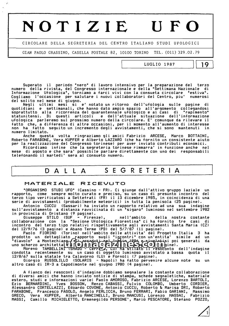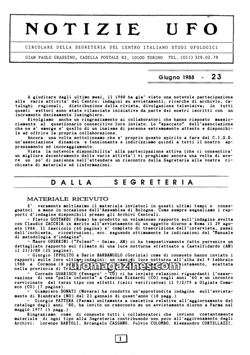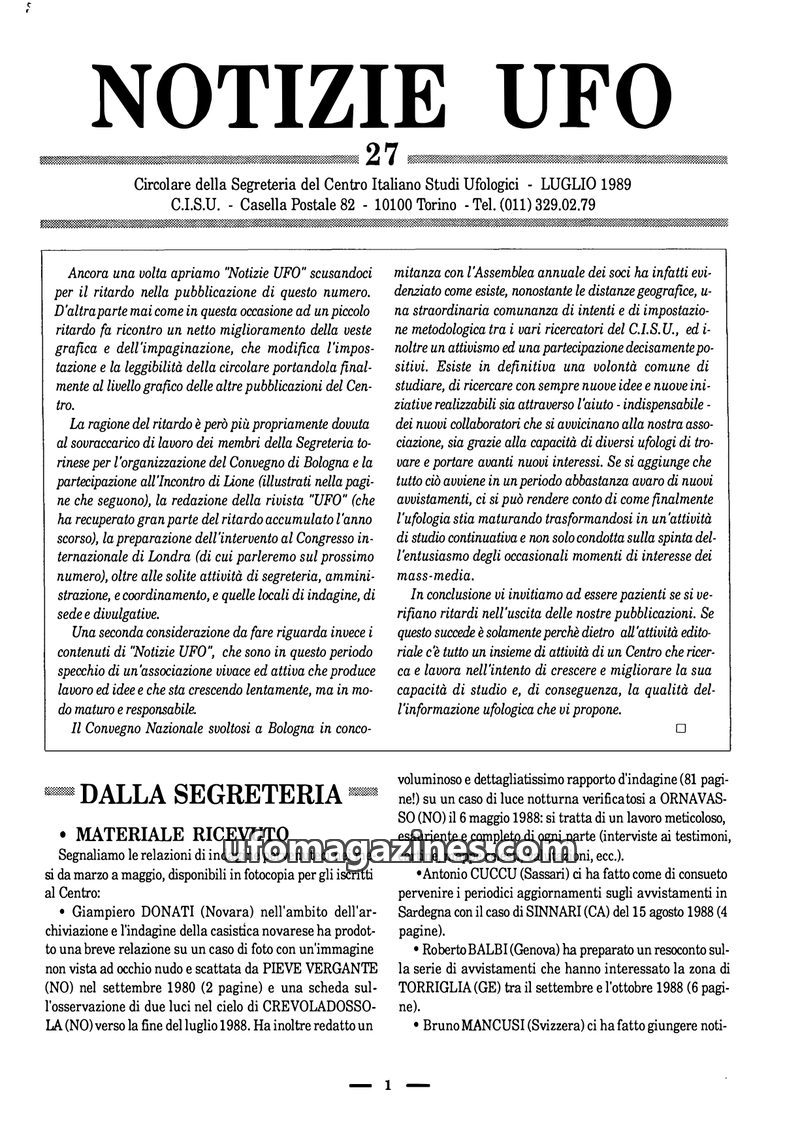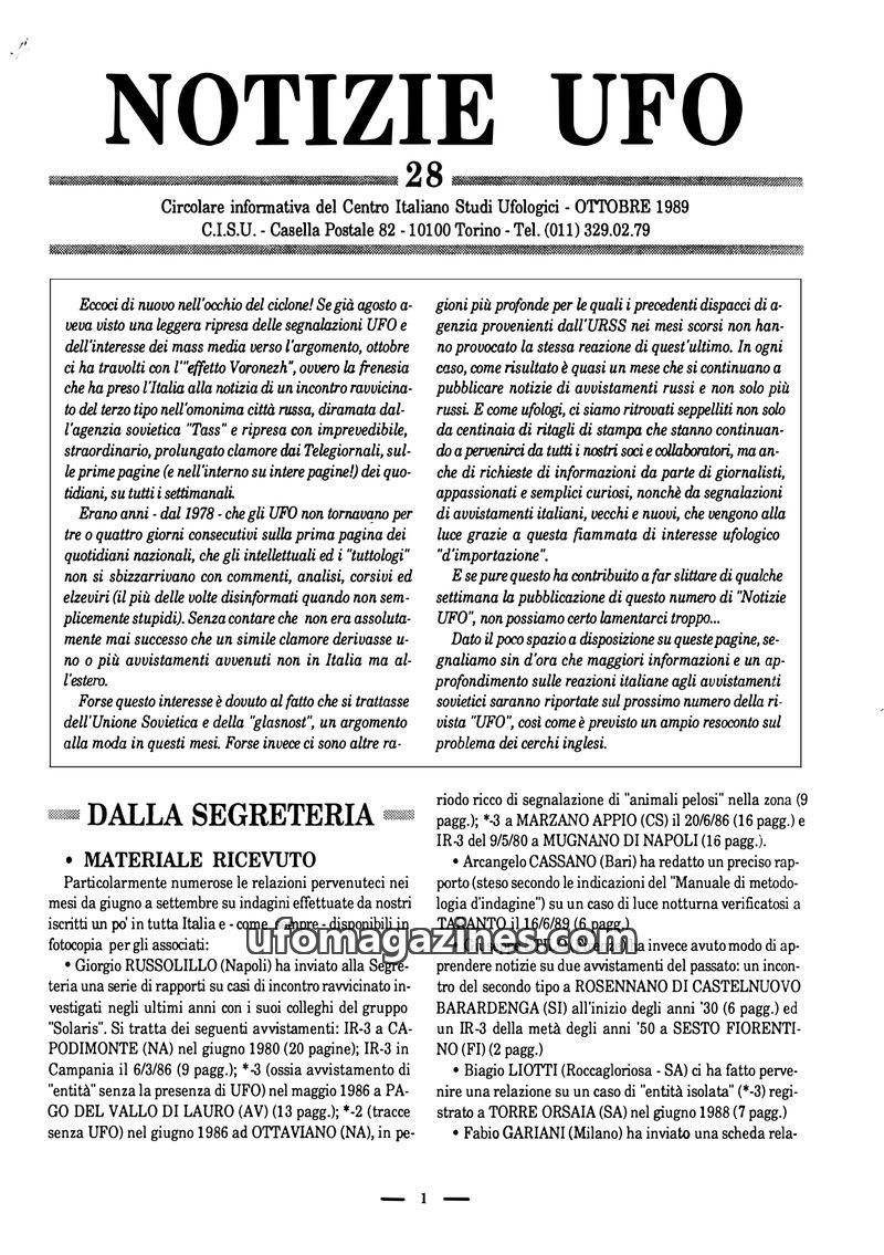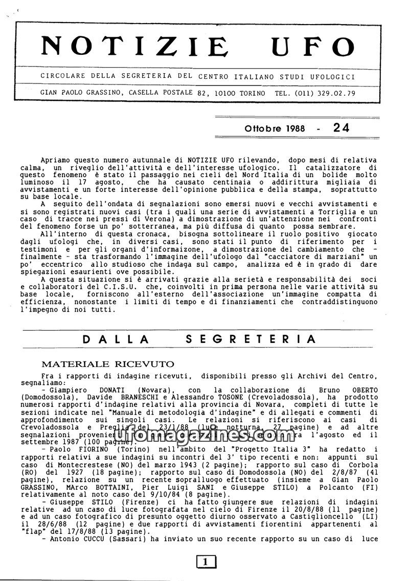 This issue of Notizie UFO reports a significant increase in UFO activity and public interest, largely catalyzed by a bright bolide sighted over Northern Italy on August 17th, 1988.