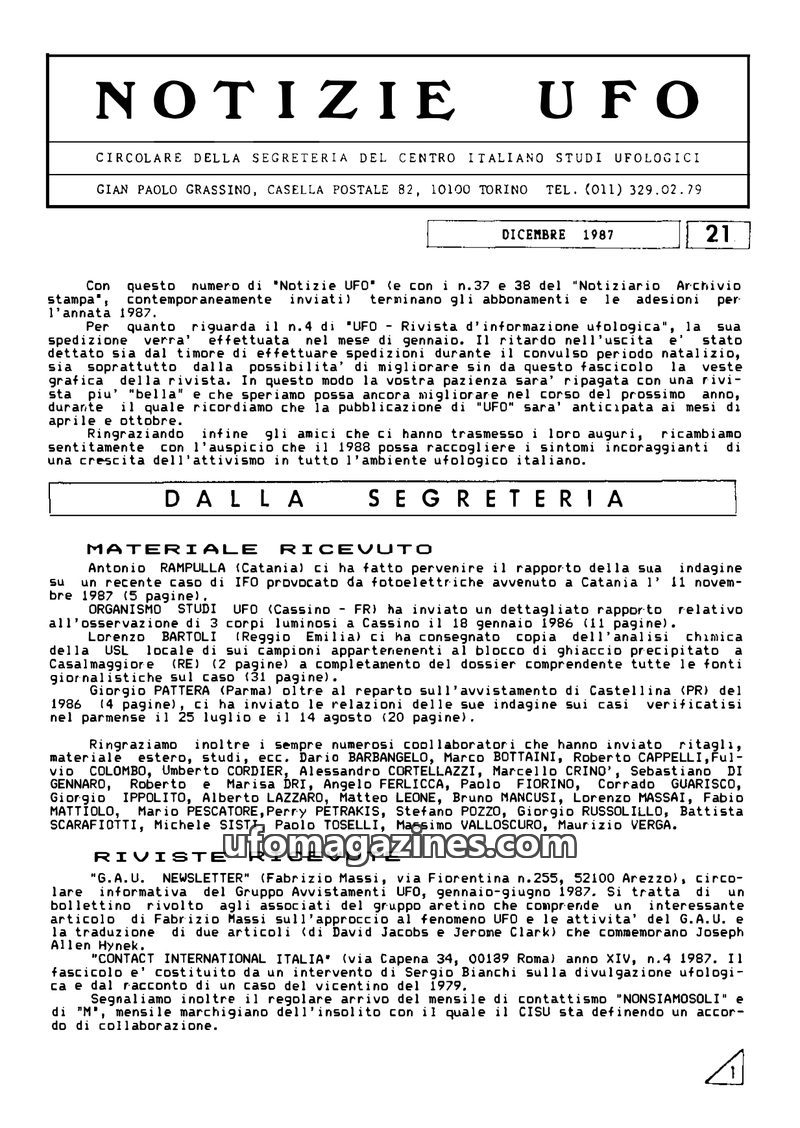 This issue of Notizie UFO, dated December 1987, announces the end of subscriptions for 1987 and previews the upcoming issue of 'UFO - Rivista d'informazione ufologica'. It details