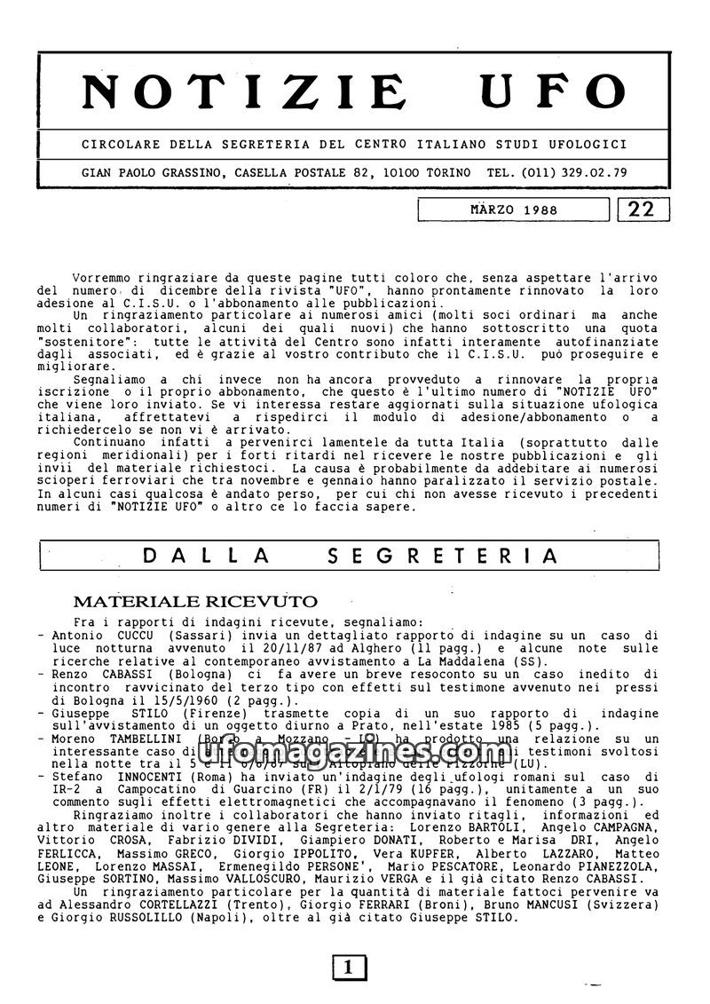 This issue of 'Notizie UFO' highlights increased participation in CISU activities in 1988, including investigations and archival research. It details numerous received investigatio