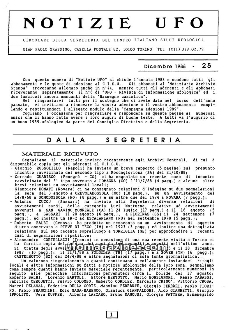 This issue of Notizie UFO marks the end of 1988, with subscription renewals encouraged for 1989. The 'Dalla Segreteria' section details recently received materials, including repor