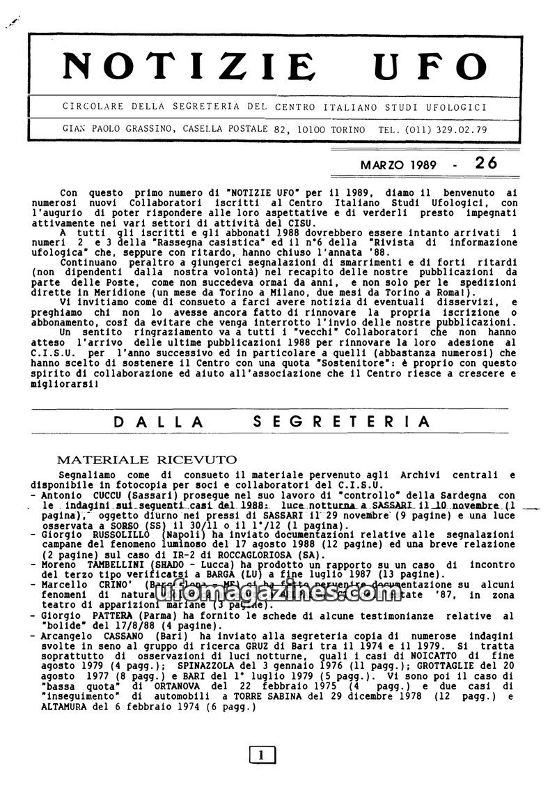 This issue of 'NOTIZIE UFO' from March 1989 welcomes new collaborators to the Centro Italiano Studi Ufologici (CISU) and provides updates on their publications. It details recent m