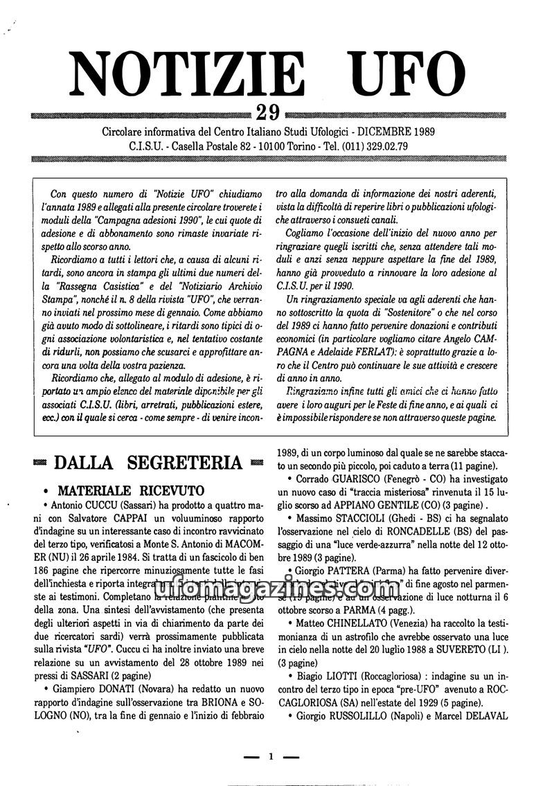 This issue of Notizie UFO, the December 1989 circular from the Centro Italiano Studi Ufologici (CISU), closes out the year and announces membership renewals for 1990. It details re