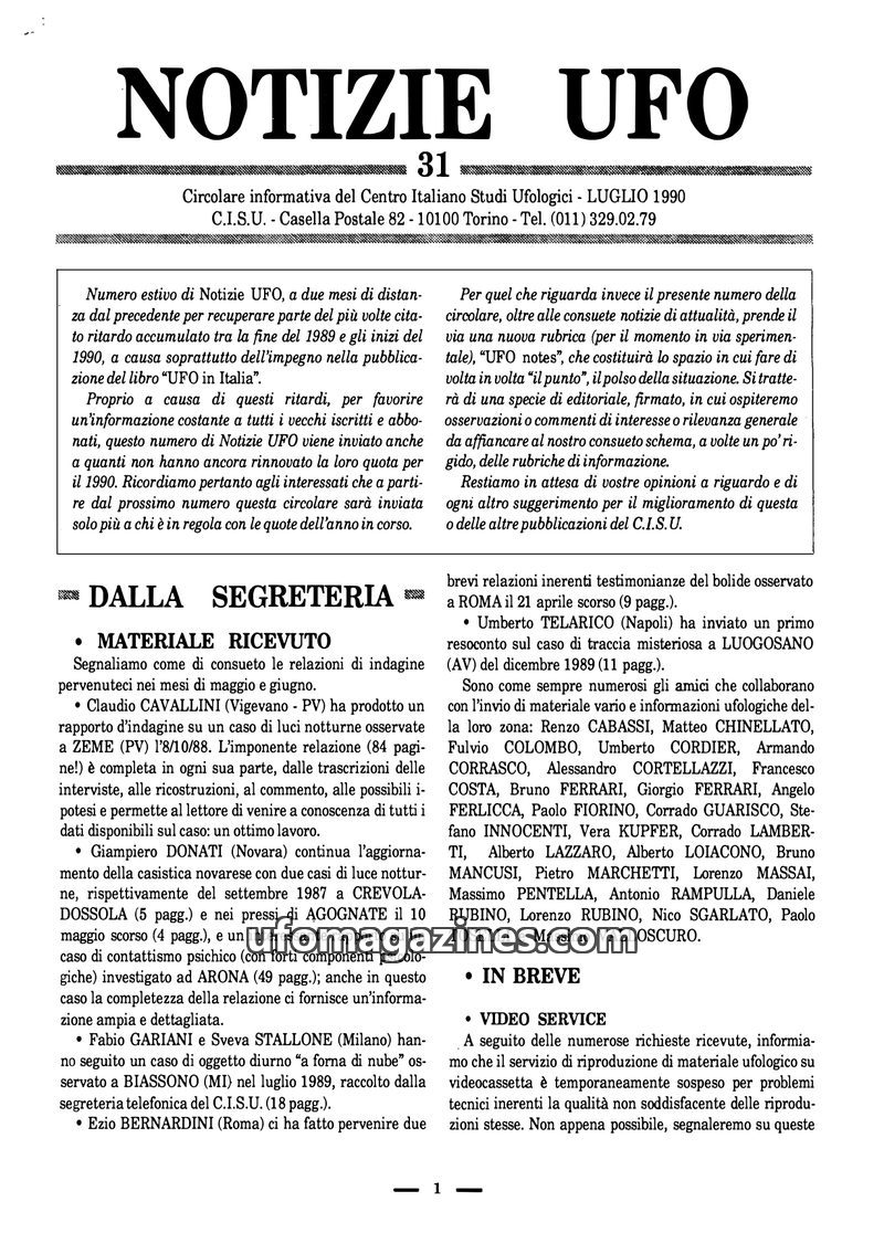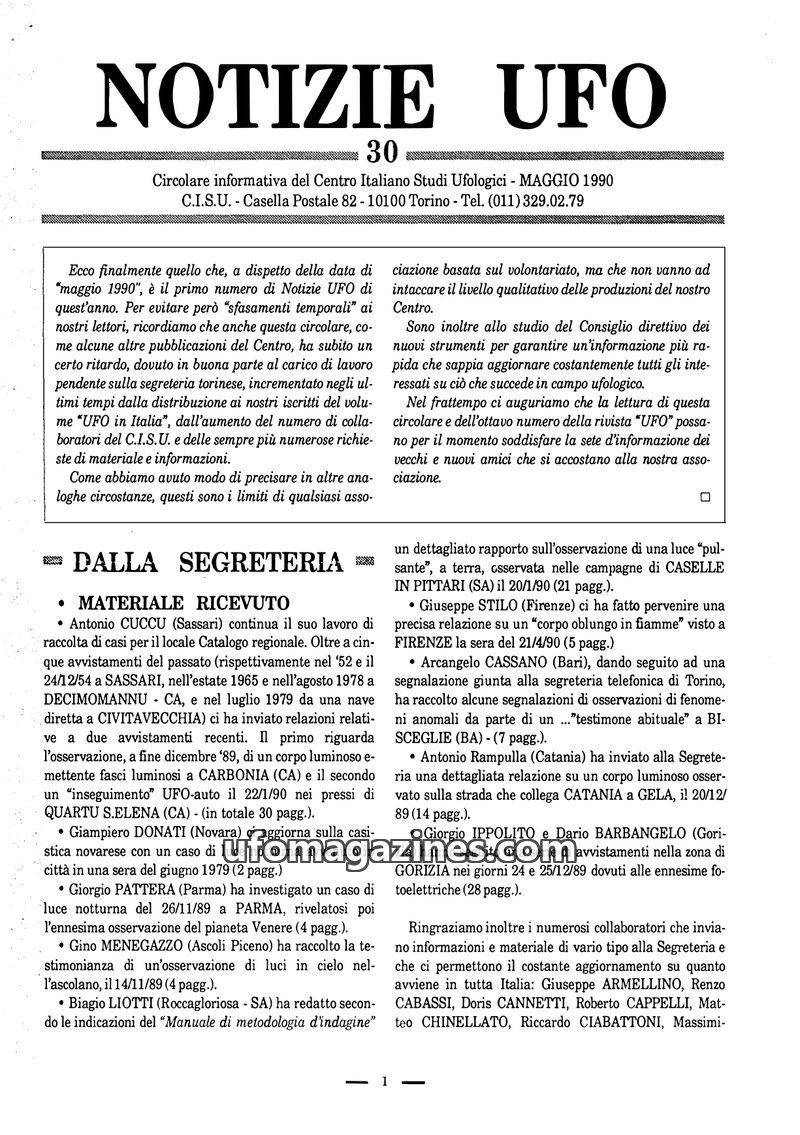 This issue of Notizie UFO, dated May 1990 but published with a delay, covers various recent UFO sightings reported across Italy. It details ongoing research projects by CISU, inclu