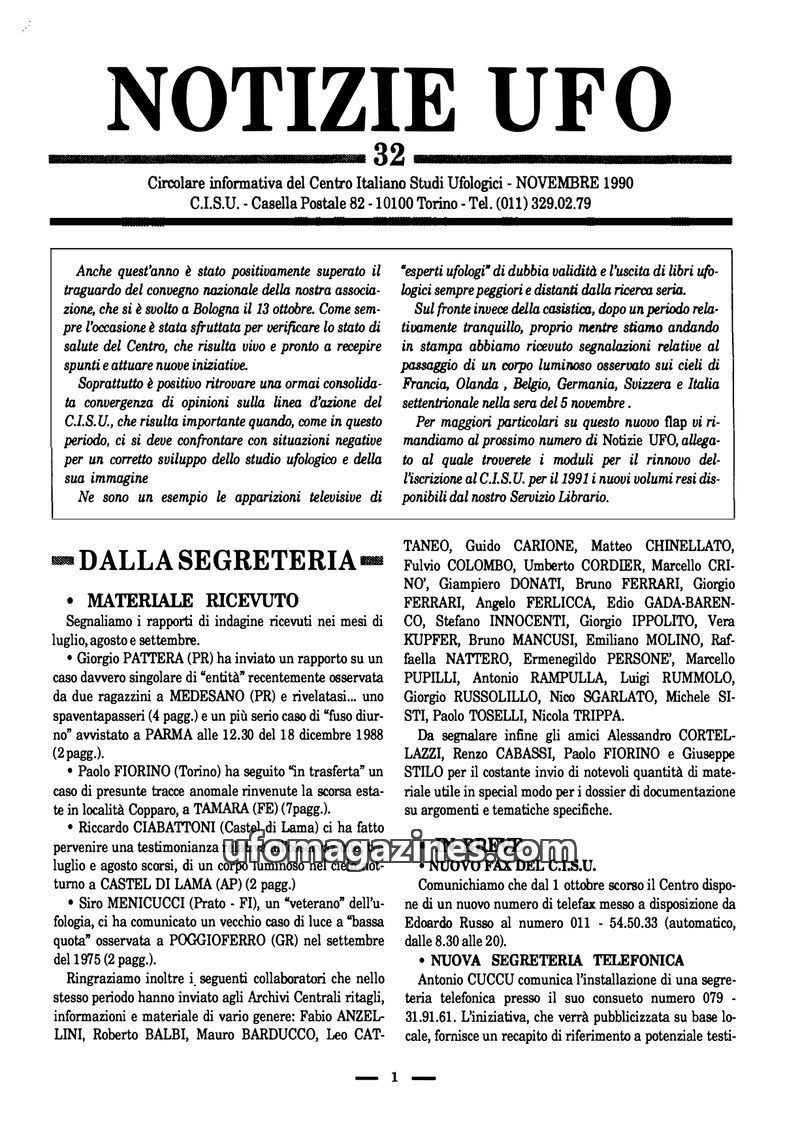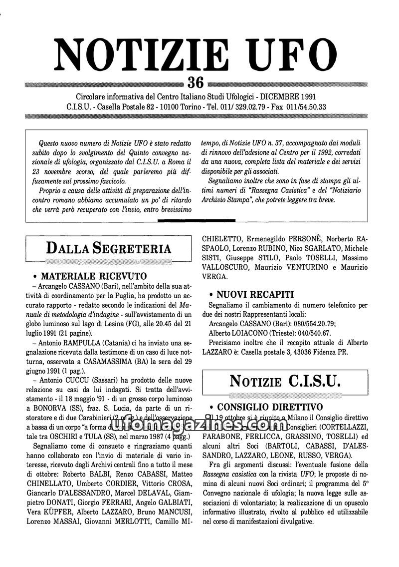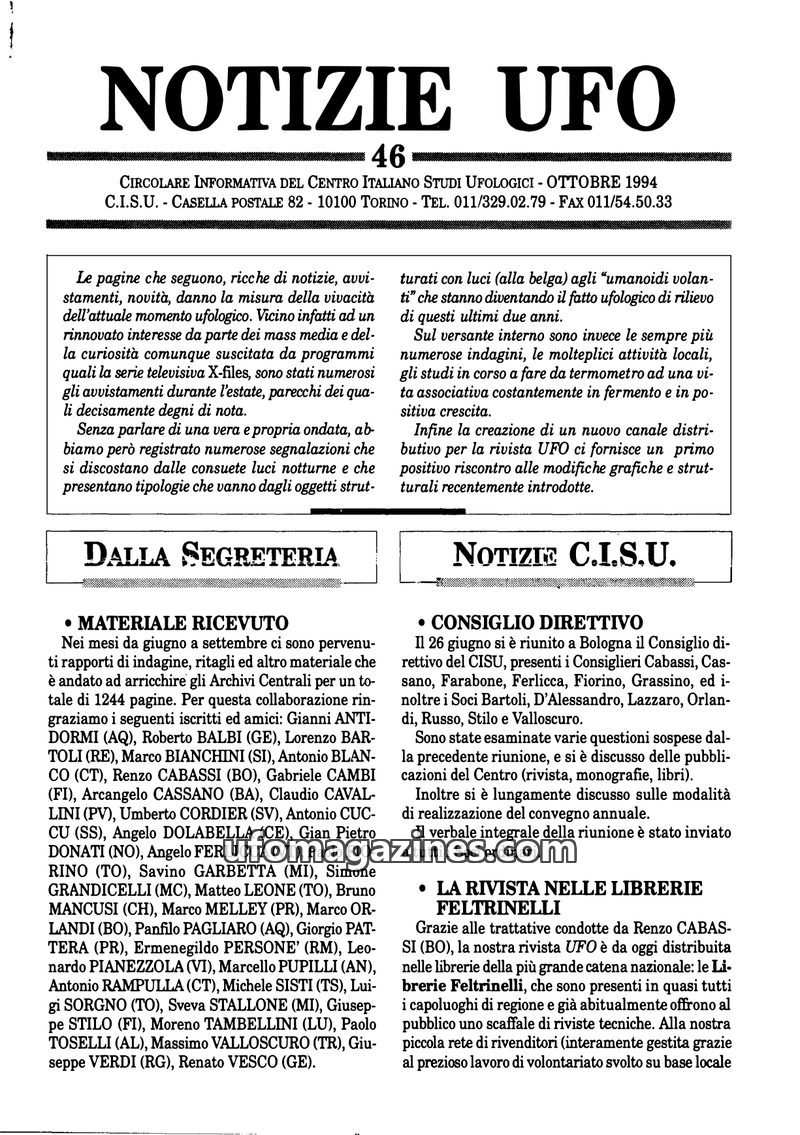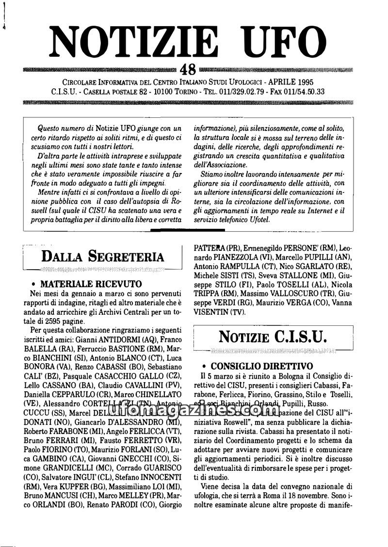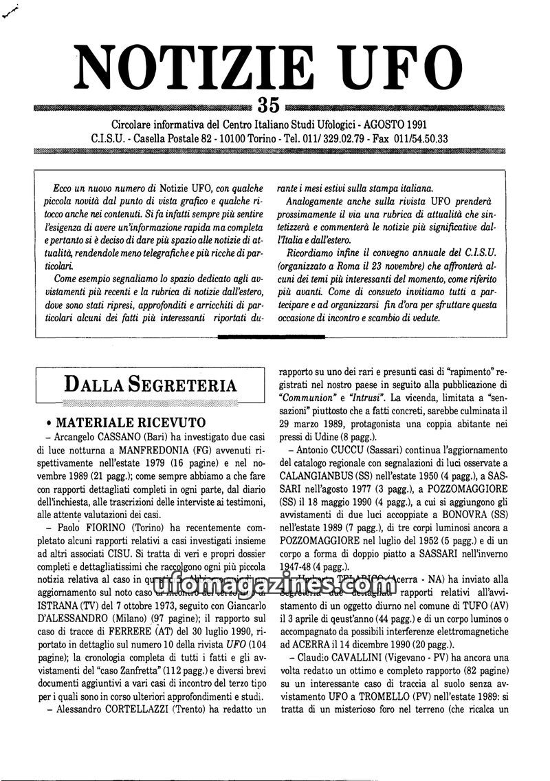 This issue of Notizie UFO highlights the CISU's activities, including organizing conferences and publishing research. It details recent UFO sightings reported across Italy and ment