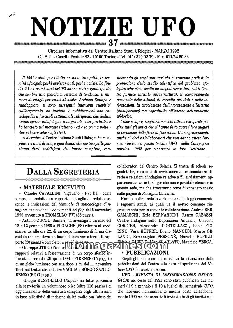 The March 1992 issue of 'Notizie UFO' reports on a quiet year for UFO sightings in Italy in 1991, with a slight increase in media attention. The Centro Italiano Studi Ufologici (CI