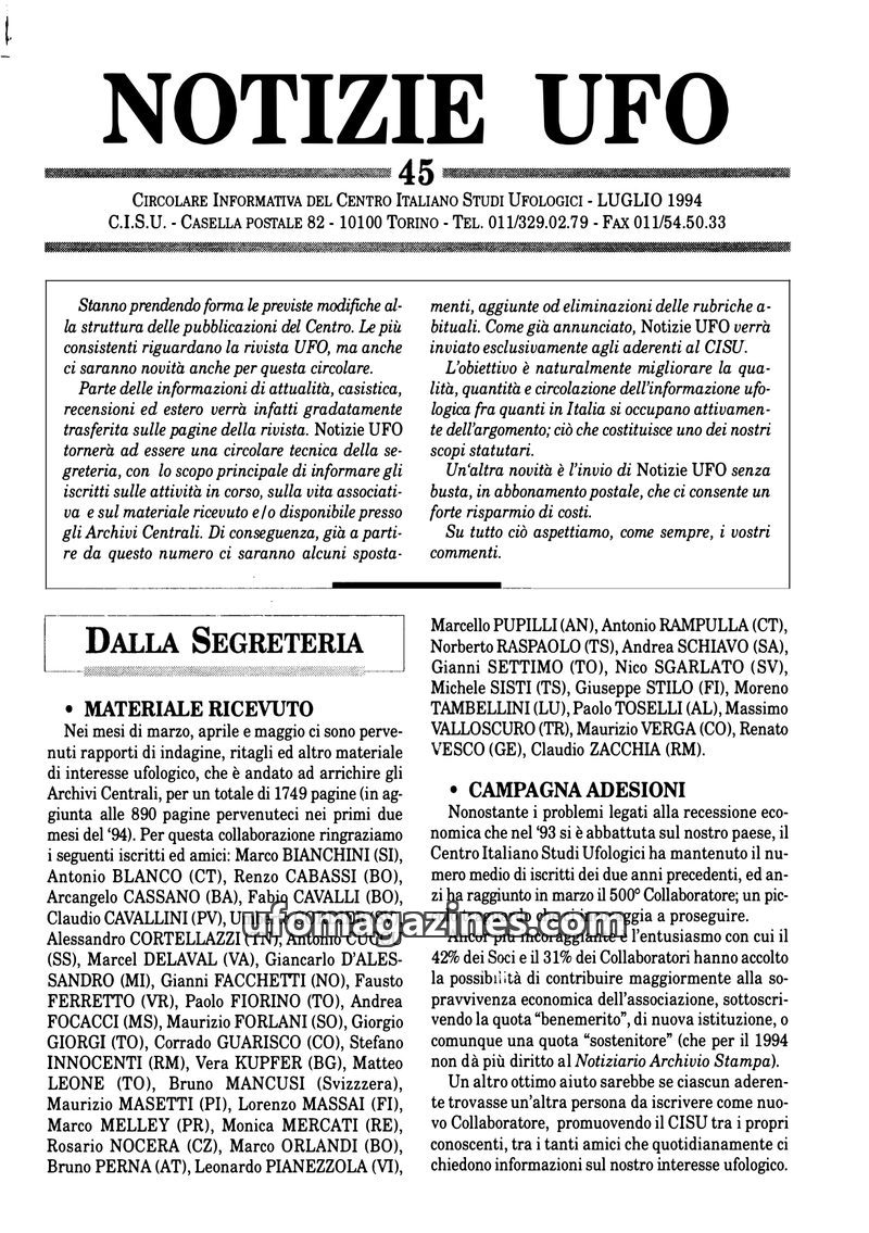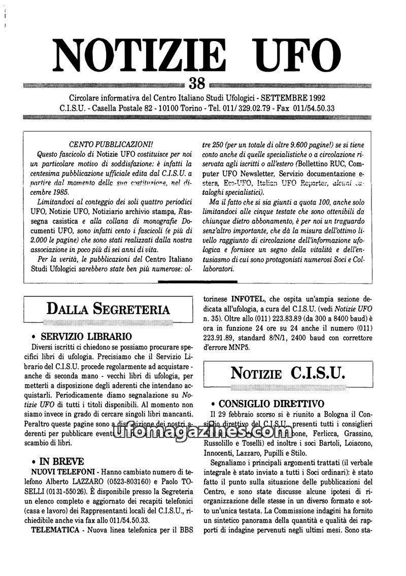 This issue of 'Notizie UFO' details changes in CISU's publication structure, with 'UFO' magazine becoming more prominent and the circular focusing on internal activities. It highli