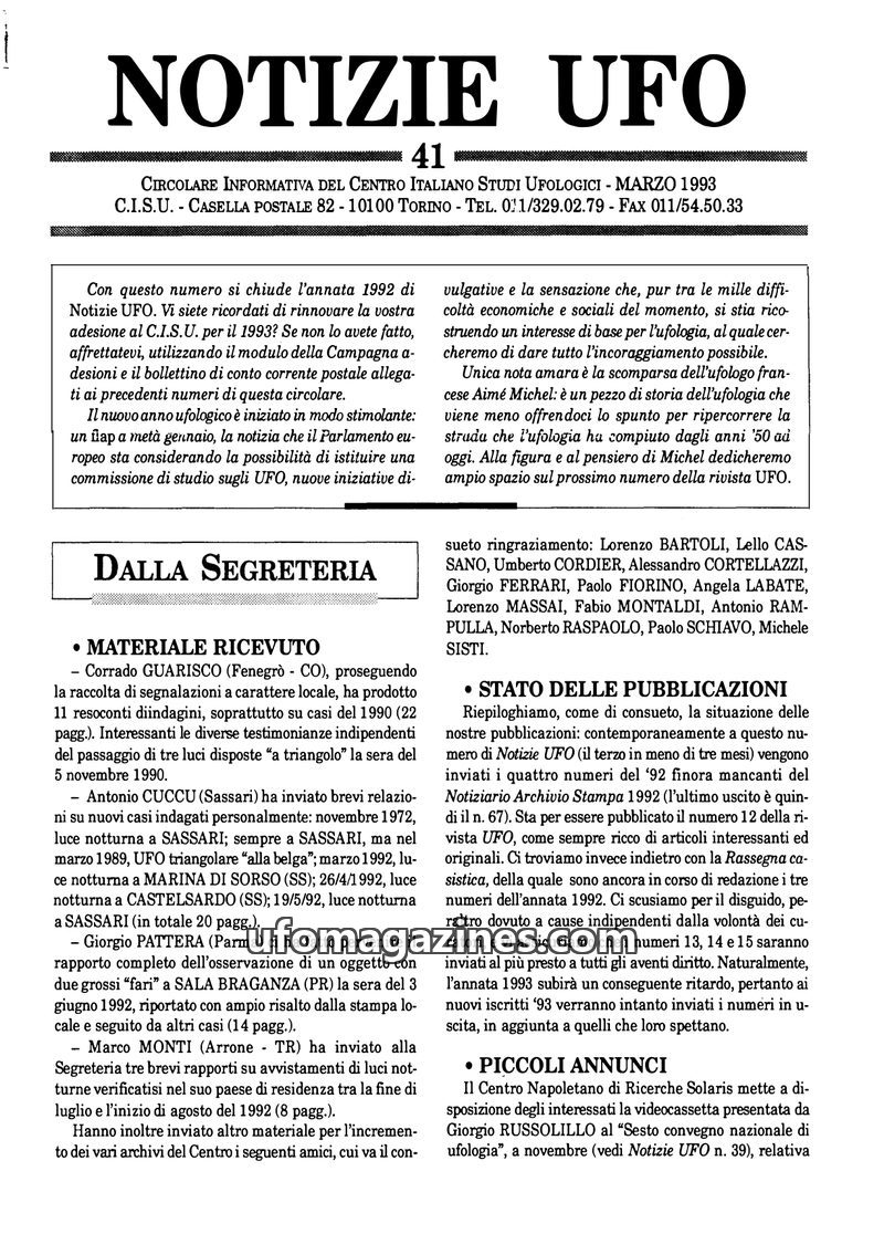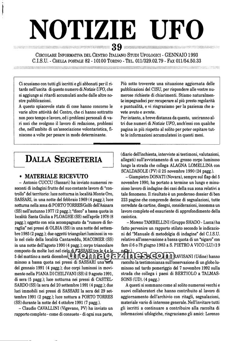 The January 1993 issue of Notizie UFO, published by CISU, addresses delays in publication due to various activities and personal issues of its volunteer staff. It provides an updat