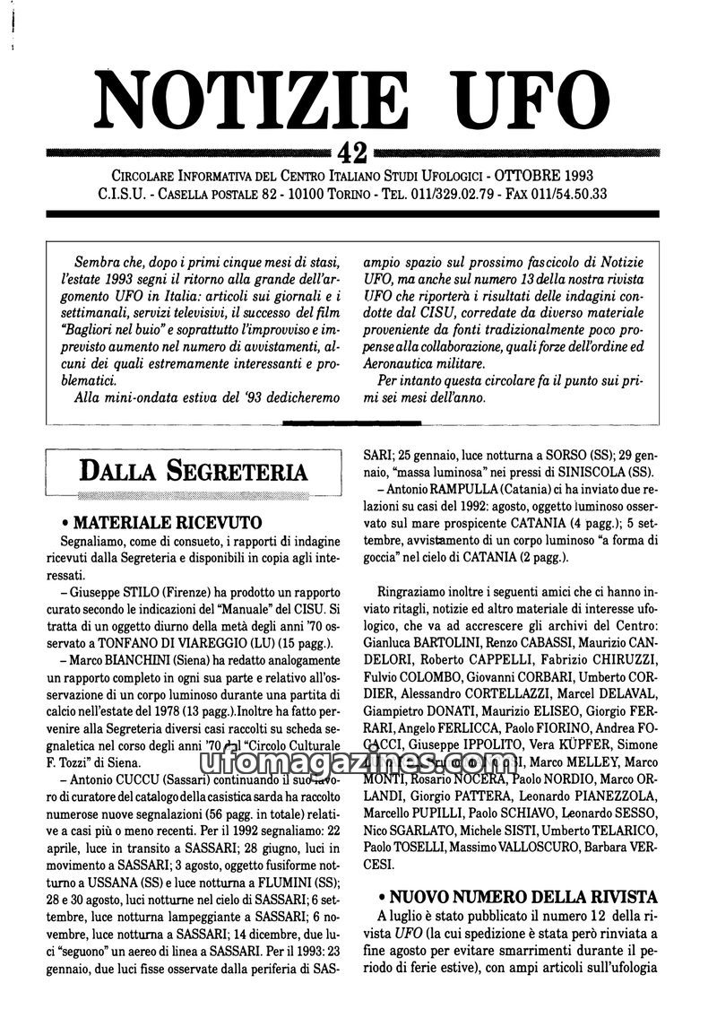 This issue of 'Notizie UFO' reports on a resurgence of UFO sightings in Italy during the summer of 1993, with numerous articles in newspapers and on television, and the success of