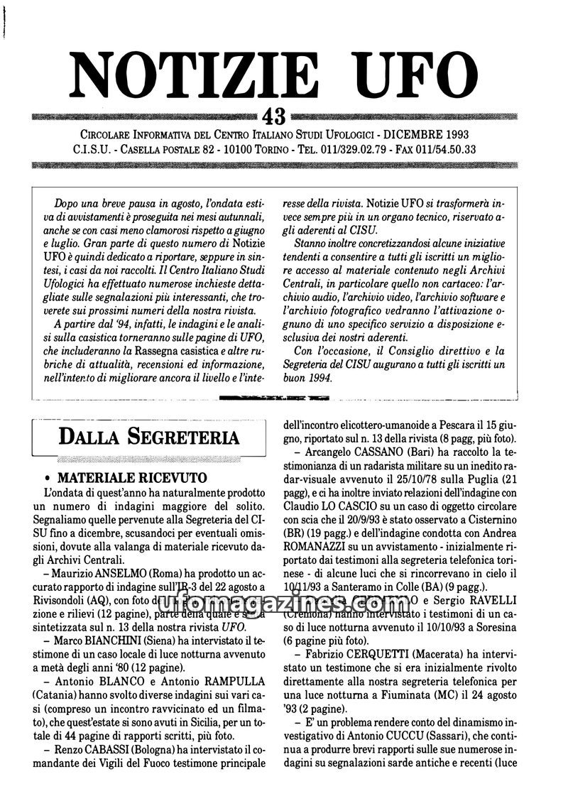 This December 1993 issue of Notizie UFO, published by the Centro Italiano Studi Ufologici (CISU), details the significant wave of UFO sightings in Italy during the summer of 1993.