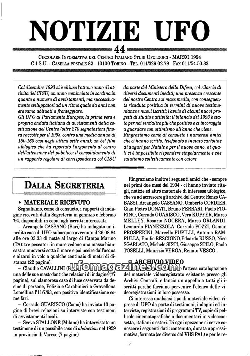 The March 1994 issue of Notizie UFO from CISU details the organization's activities in 1993, highlighting a significant increase in UFO sightings and media attention. The issue inc
