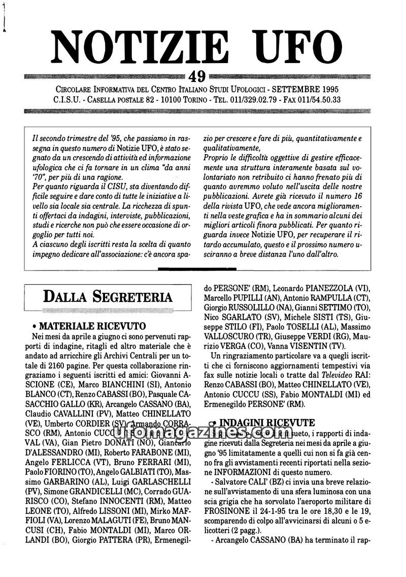 This issue of Notizie UFO (September 1995) highlights a surge in UFO activity and information, with the CISU (Centro Italiano Studi Ufologici) reporting a significant increase in r