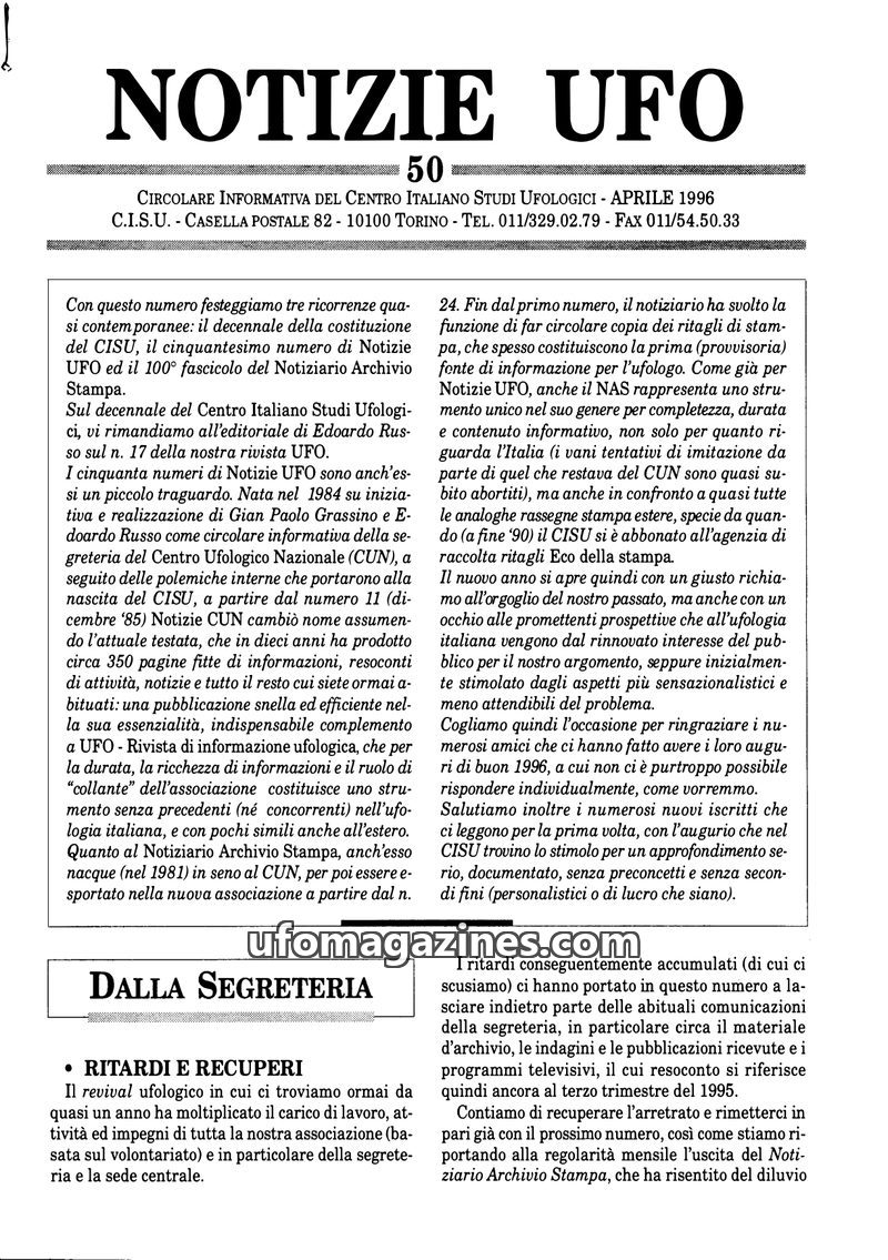 This March 1997 issue of Notizie UFO, the newsletter of the Italian Center for Ufological Studies (CISU), marks the 50th anniversary of ufology with a nod to the Kenneth Arnold sig