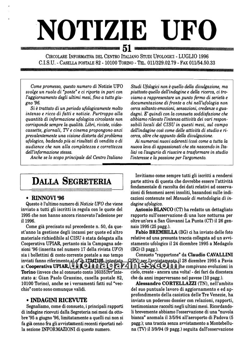 This issue of Notizie UFO, dated July 1996, serves as an update for the Centro Italiano Studi Ufologici (CISU) members, covering activities from late 1995 to mid-1996. It details n