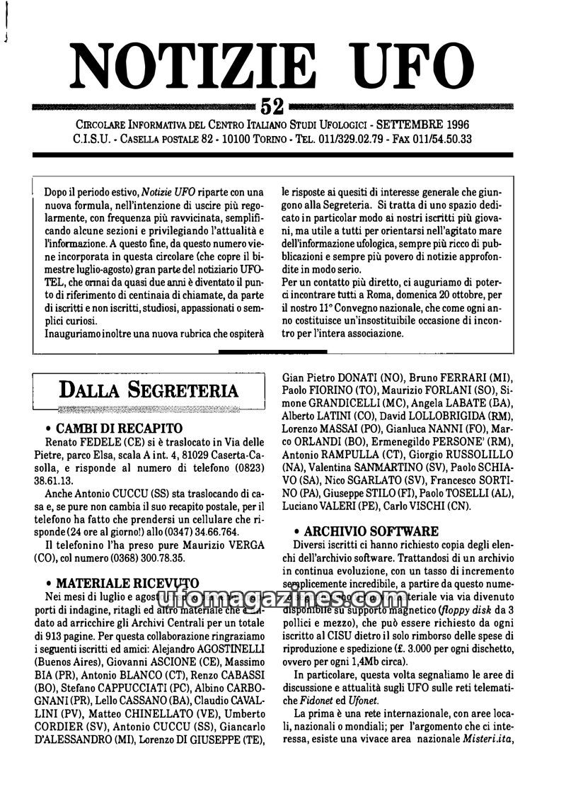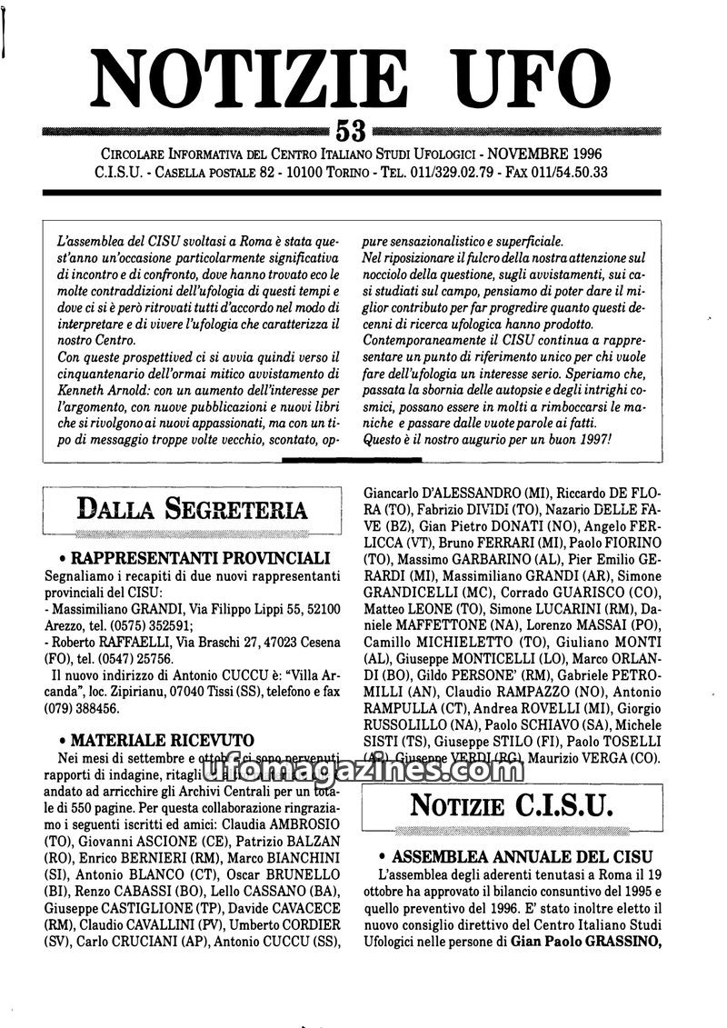 The November 1996 issue of Notizie UFO, published by the Centro Italiano Studi Ufologici (CISU), covers various aspects of ufology. It details the CISU's annual assembly, the elect