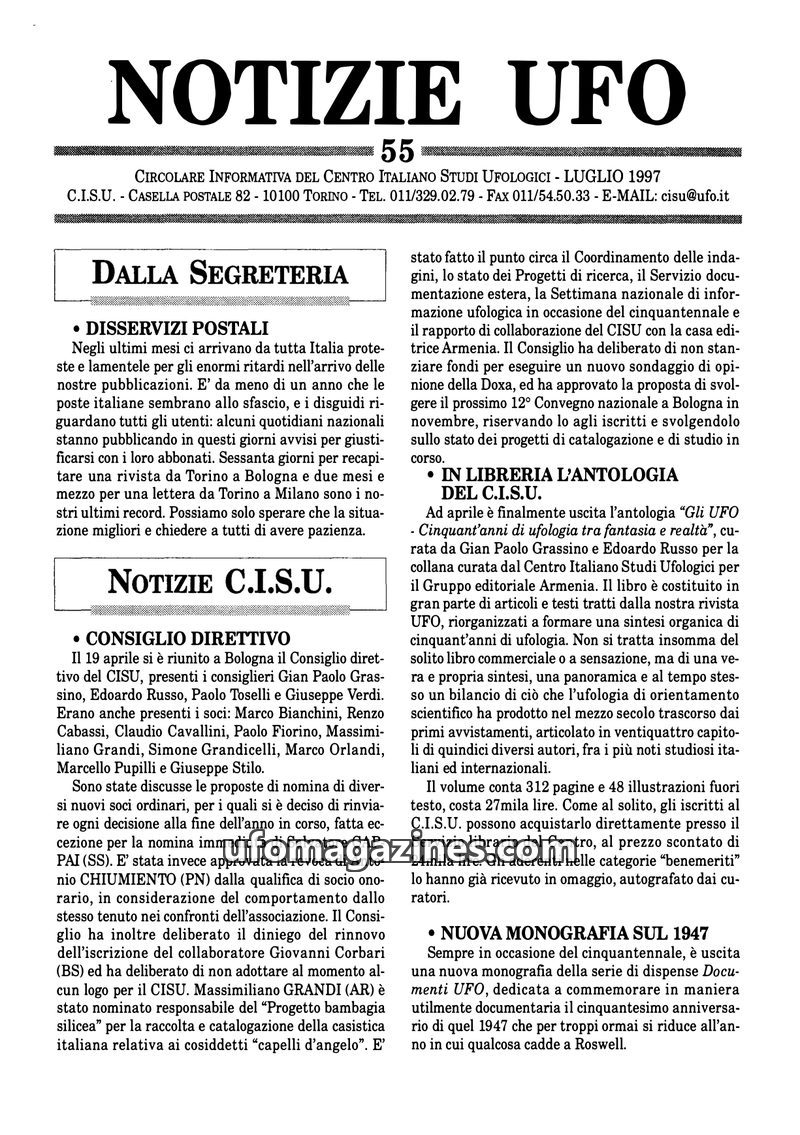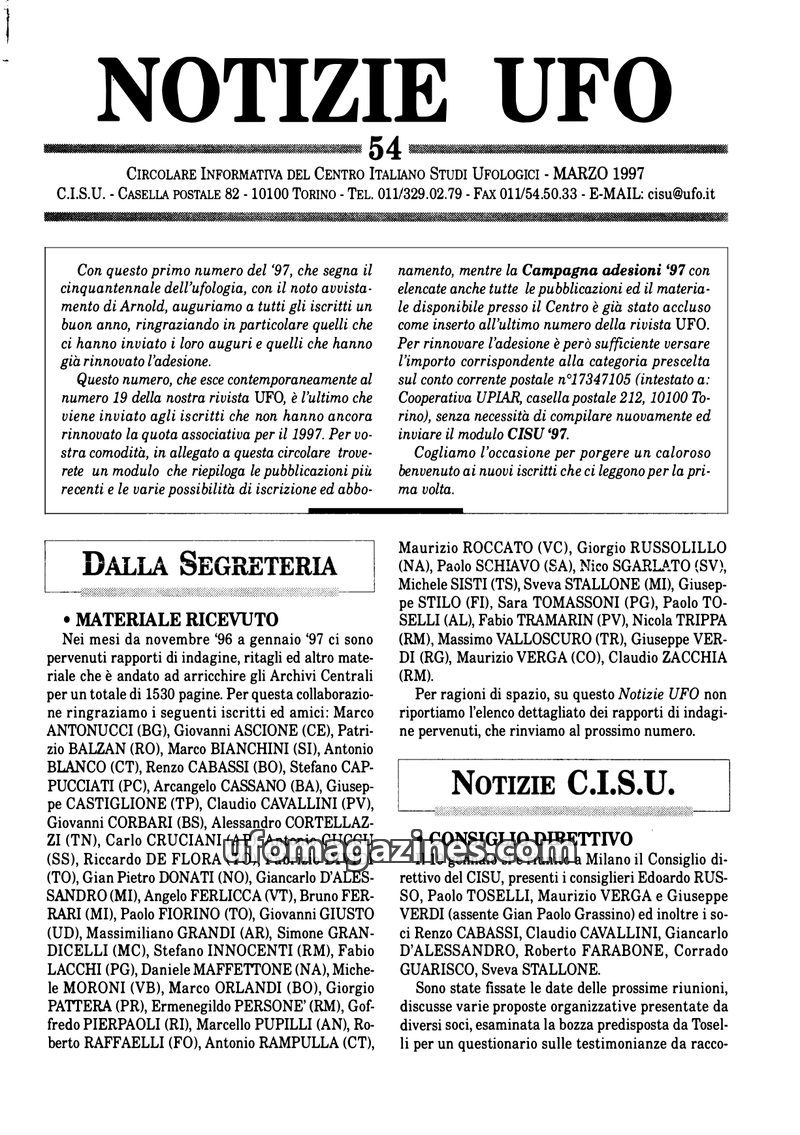 This issue of Notizie UFO from July 1997 details the activities of the Italian Center for Ufological Studies (CISU), including a board meeting, discussions on new members, and the
